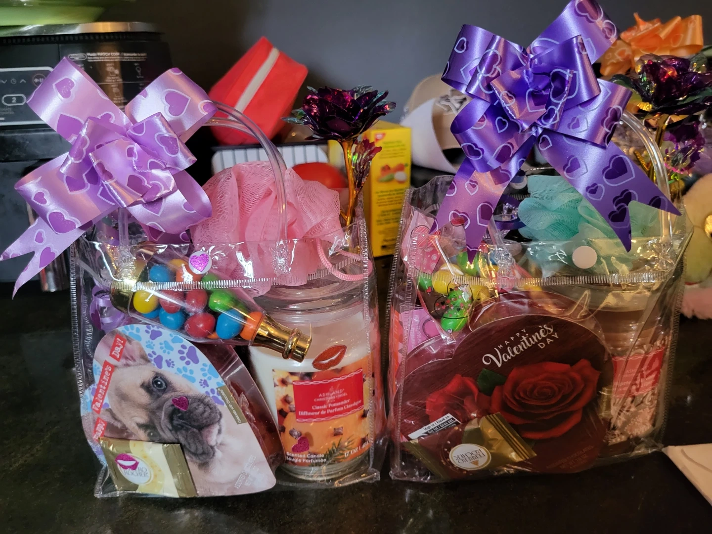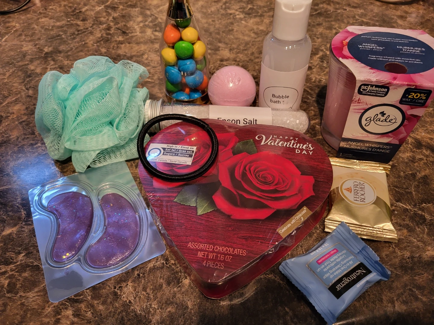 Valentine's Day gift basket filled with assorted goodies! Includes items such as a bath bomb, chocolates, a scented candle, and more! Perfect as a gift for a loved one or yourself