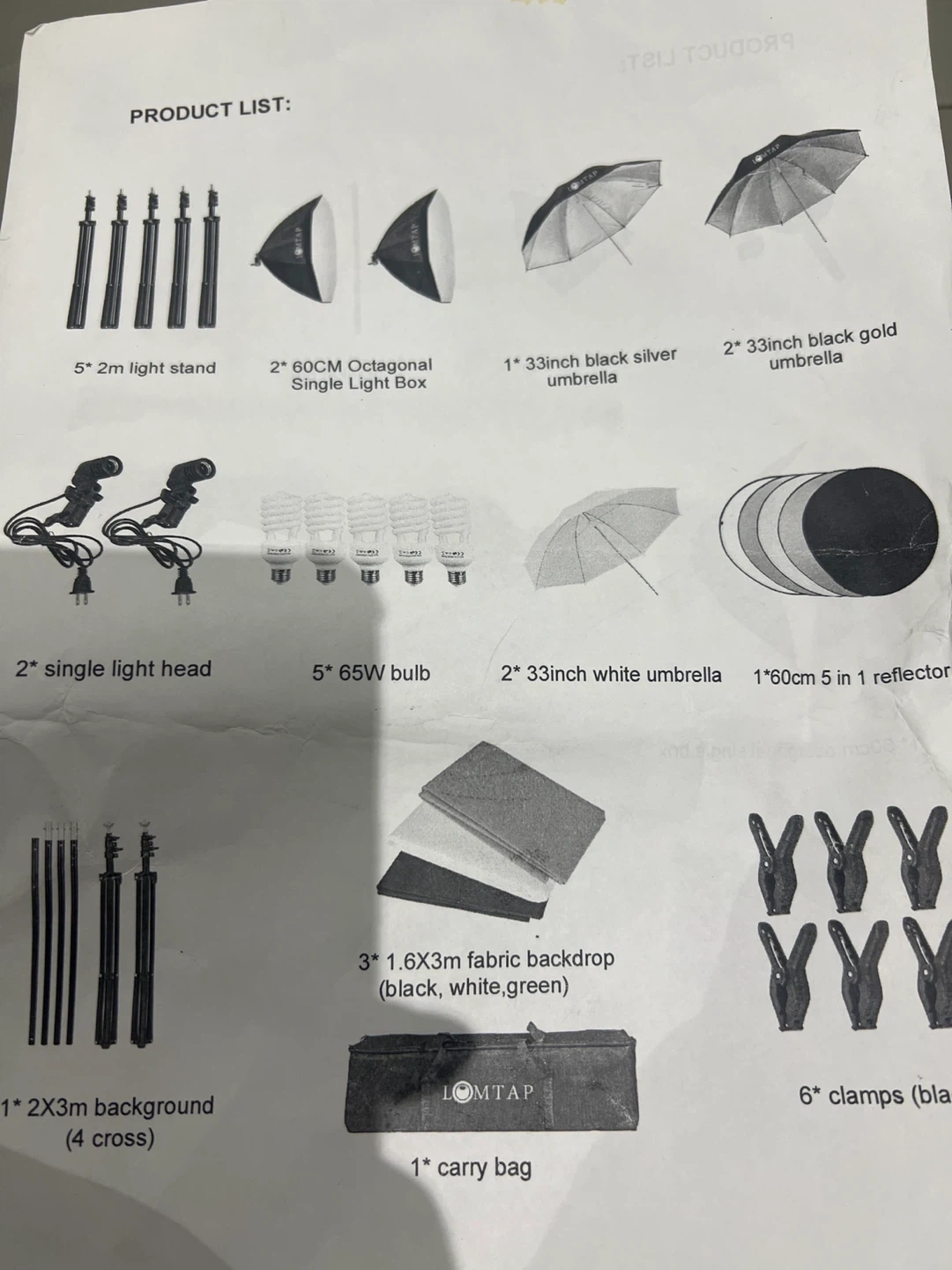 Selling a LOMTAP 2mx3m background support system and 65W 5500K softbox umbrellas lighting kit. The kit includes: