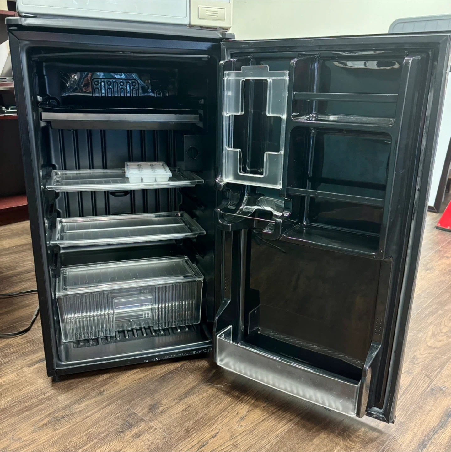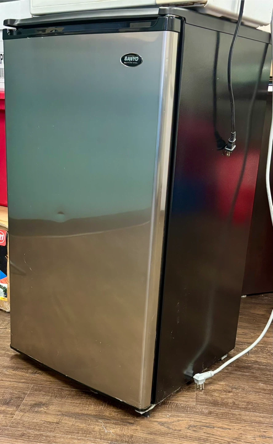 Selling a Sanyo mini fridge! It's perfect for a small space, dorm room, or office. It has a sleek design with a silver-tone door and black sides. Inside, there are adjustable shelves and door storage for your convenience