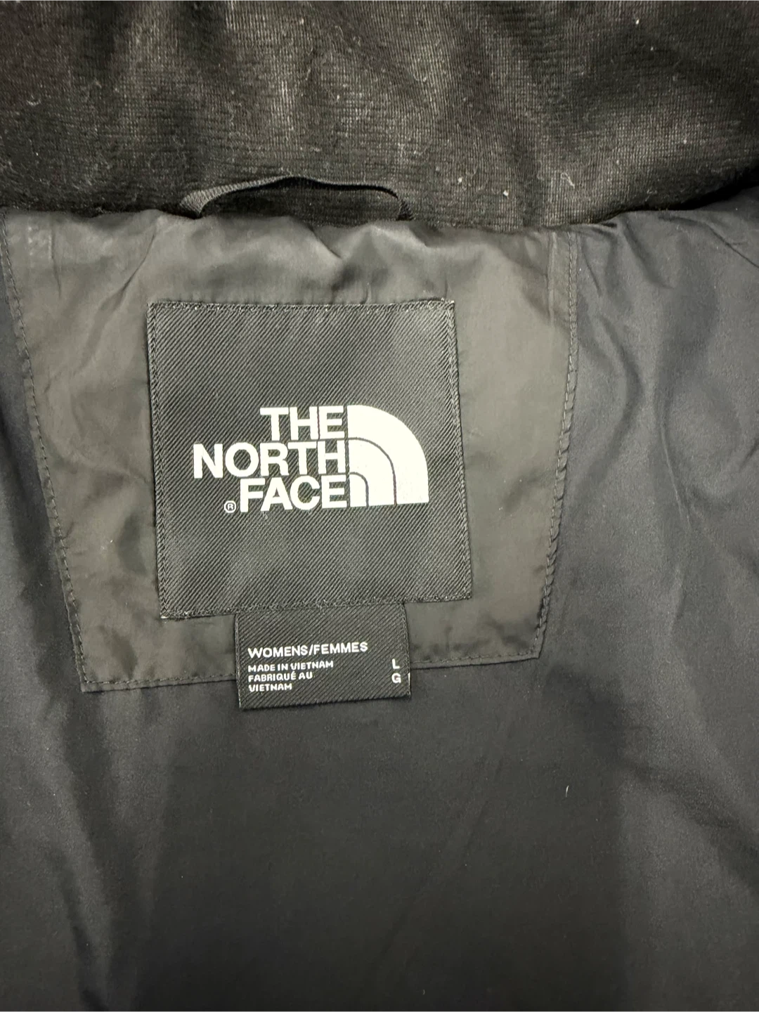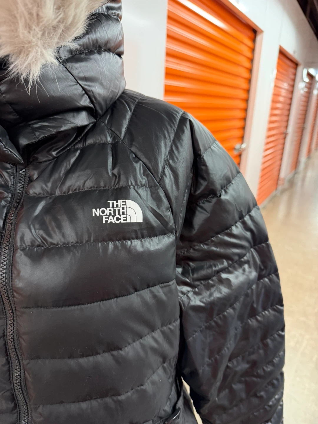 Selling a stylish and warm The North Face down puffer jacket in black. This jacket is a women's size large and features a cozy fur-trimmed hood. Perfect for staying warm during the colder months!