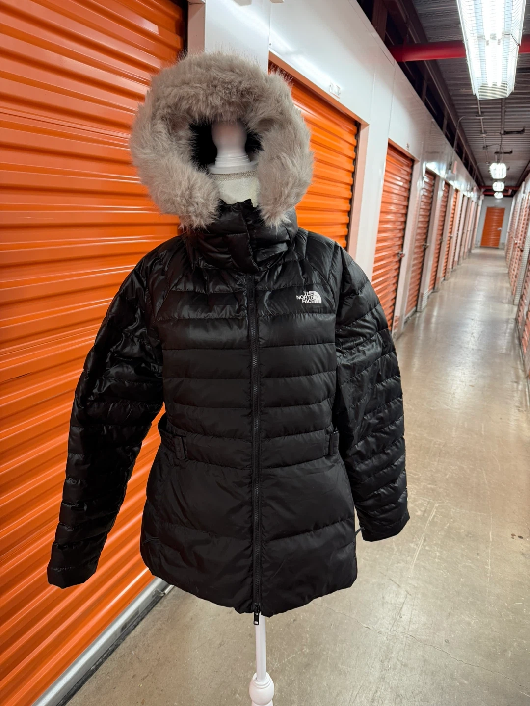 Selling a stylish and warm The North Face down puffer jacket in black. This jacket is a women's size large and features a cozy fur-trimmed hood. Perfect for staying warm during the colder months!