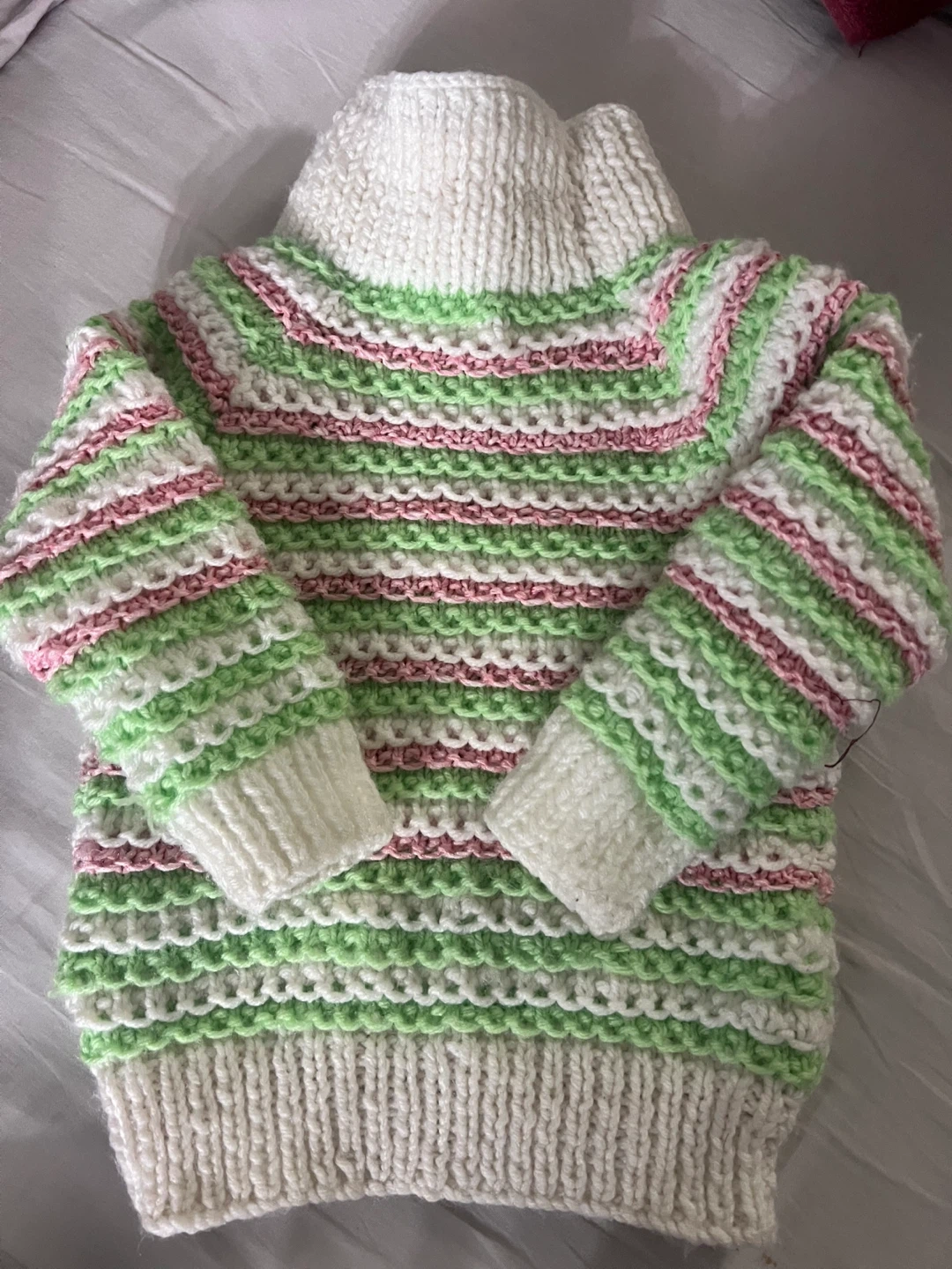 Selling a cute handmade knit sweater! It features a striped pattern with white, green, and pink. Perfect for keeping cozy!