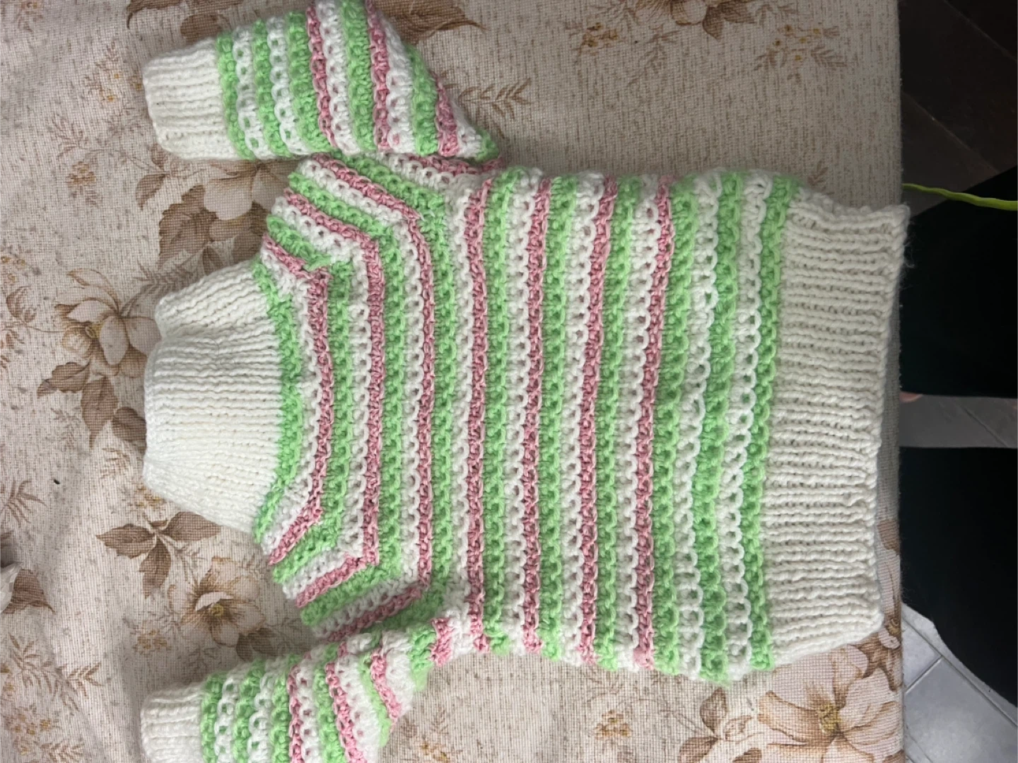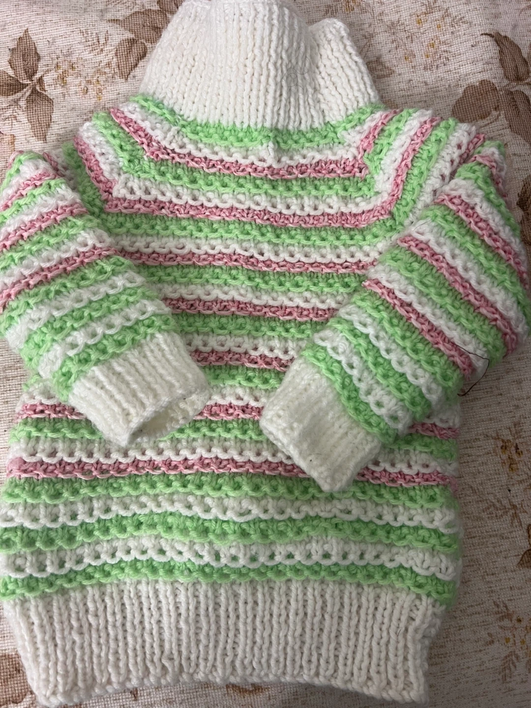 Selling a cute handmade knit sweater! It features a striped pattern with white, green, and pink. Perfect for keeping cozy!