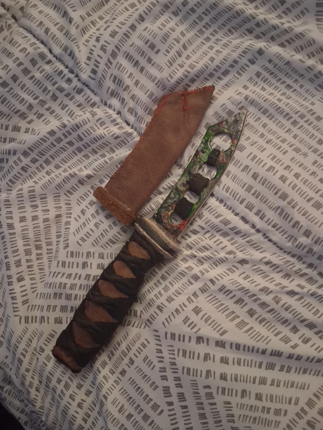 Selling a handmade knife, comes with a sheath. The handle is wrapped with a textured material, and the blade has a unique design. It shows some signs of use.