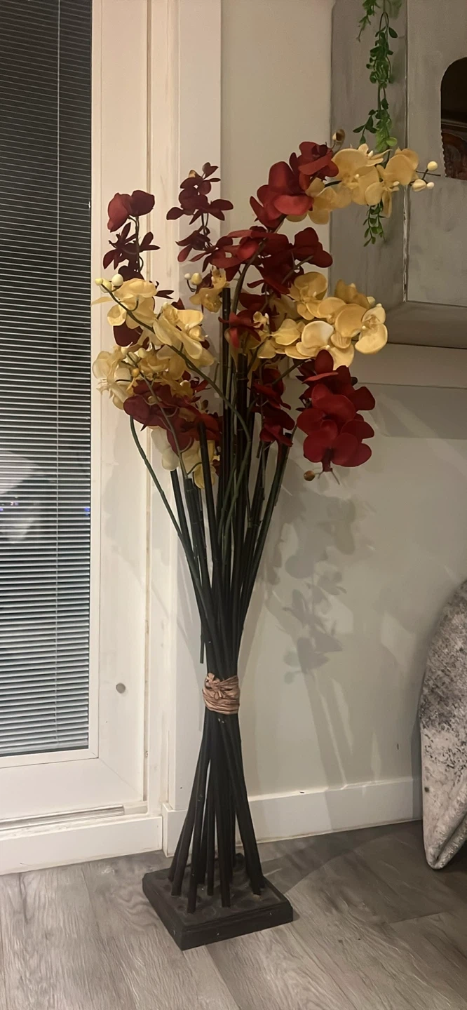 Add a touch of elegance to your home with this artificial orchid flower arrangement! Featuring a mix of red and yellow orchids, it's perfect for adding a pop of colour to any room. The arrangement is in great condition and ready to brighten up your space