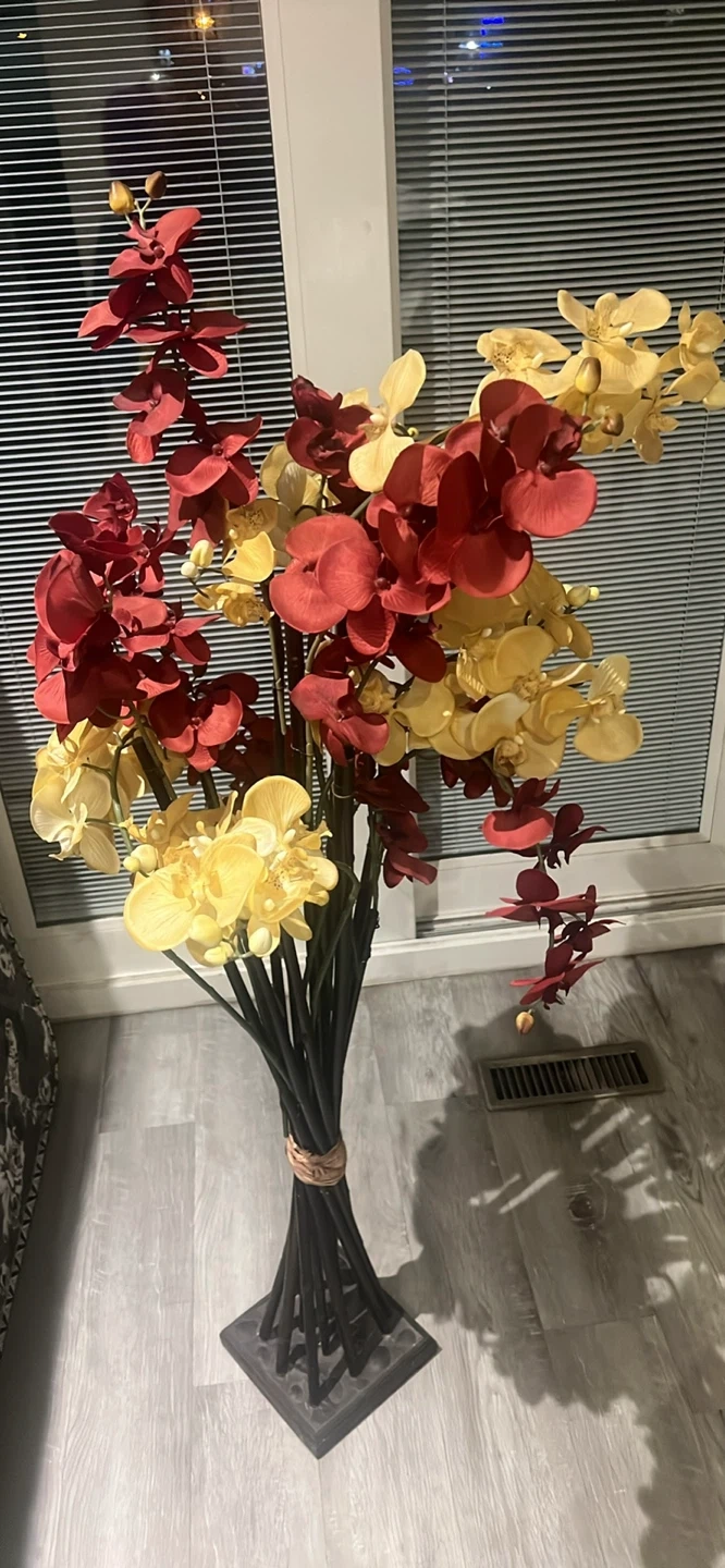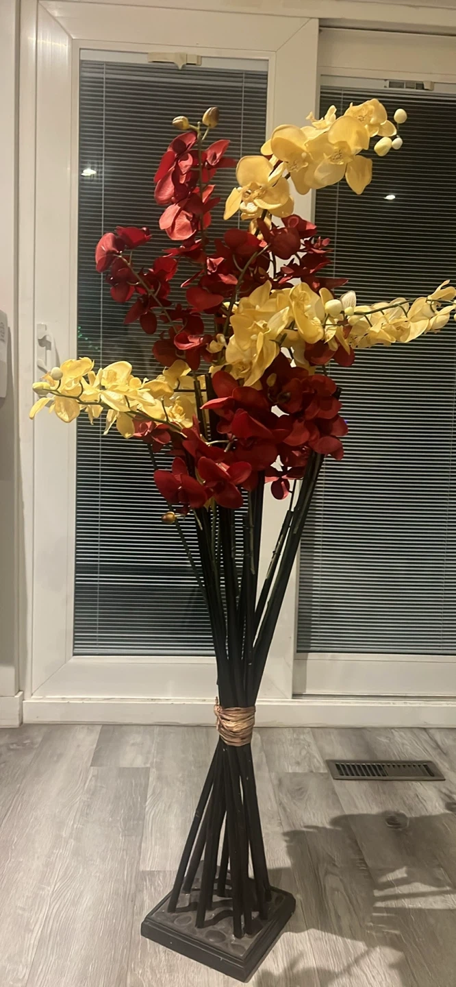 Add a touch of elegance to your home with this artificial orchid flower arrangement! Featuring a mix of red and yellow orchids, it's perfect for adding a pop of colour to any room. The arrangement is in great condition and ready to brighten up your space