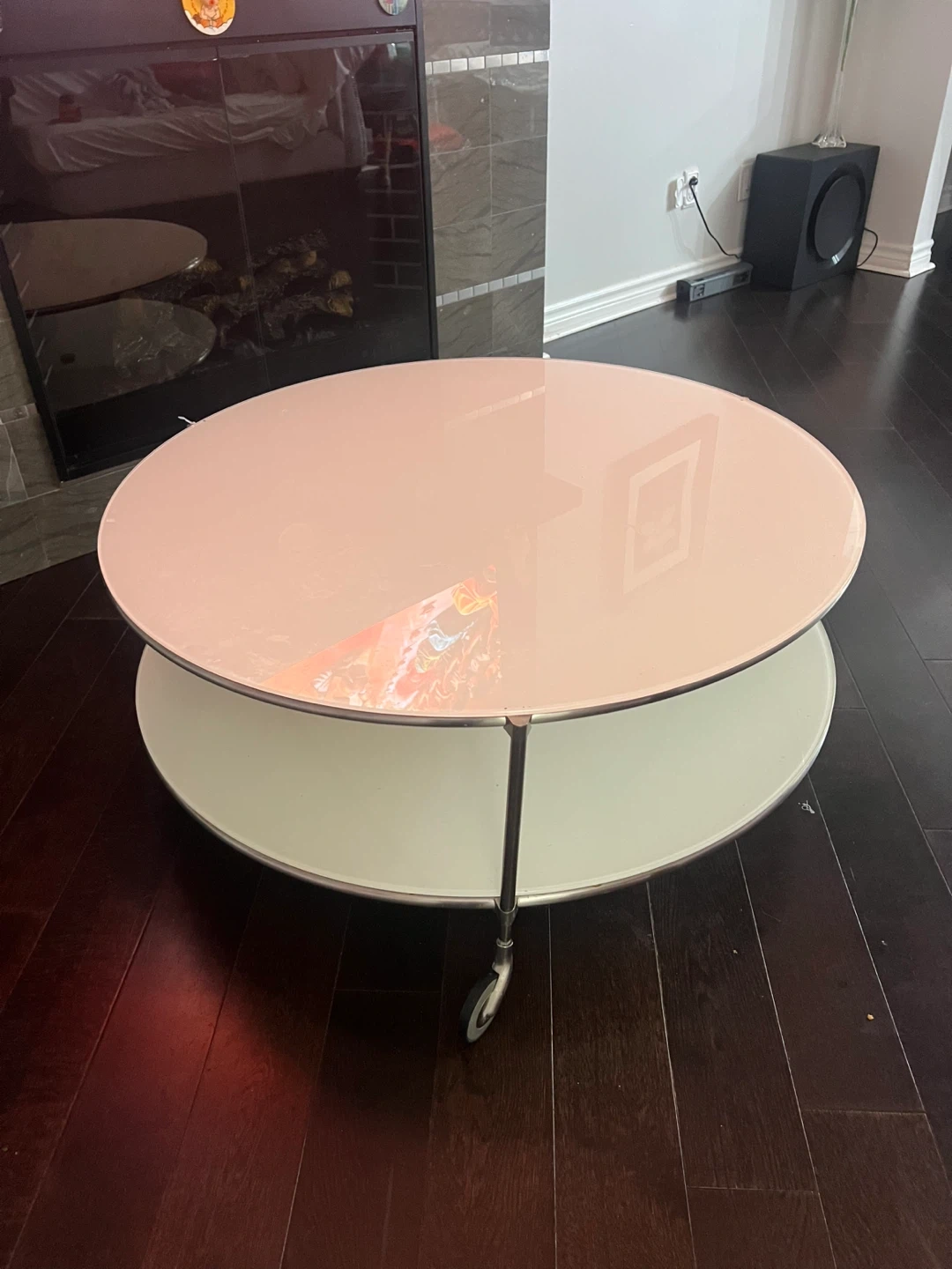 Selling a round glass coffee table with a lower shelf. It has a sleek, modern design and is in good condition. The table features a light pink glass top and a white shelf, supported by a metal frame with wheels for easy movement. It's a stylish addition to any living room!