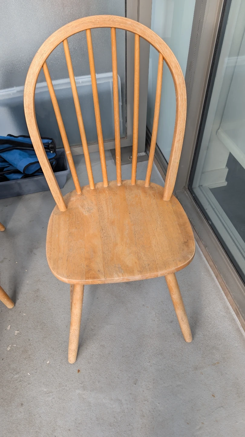 2-Classic wooden spindle back chair, perfect for adding a touch of charm to any room! Comes with a comfy seat cushion featuring a subtle pattern and light blue trim. It's in great shape and ready for a new home
