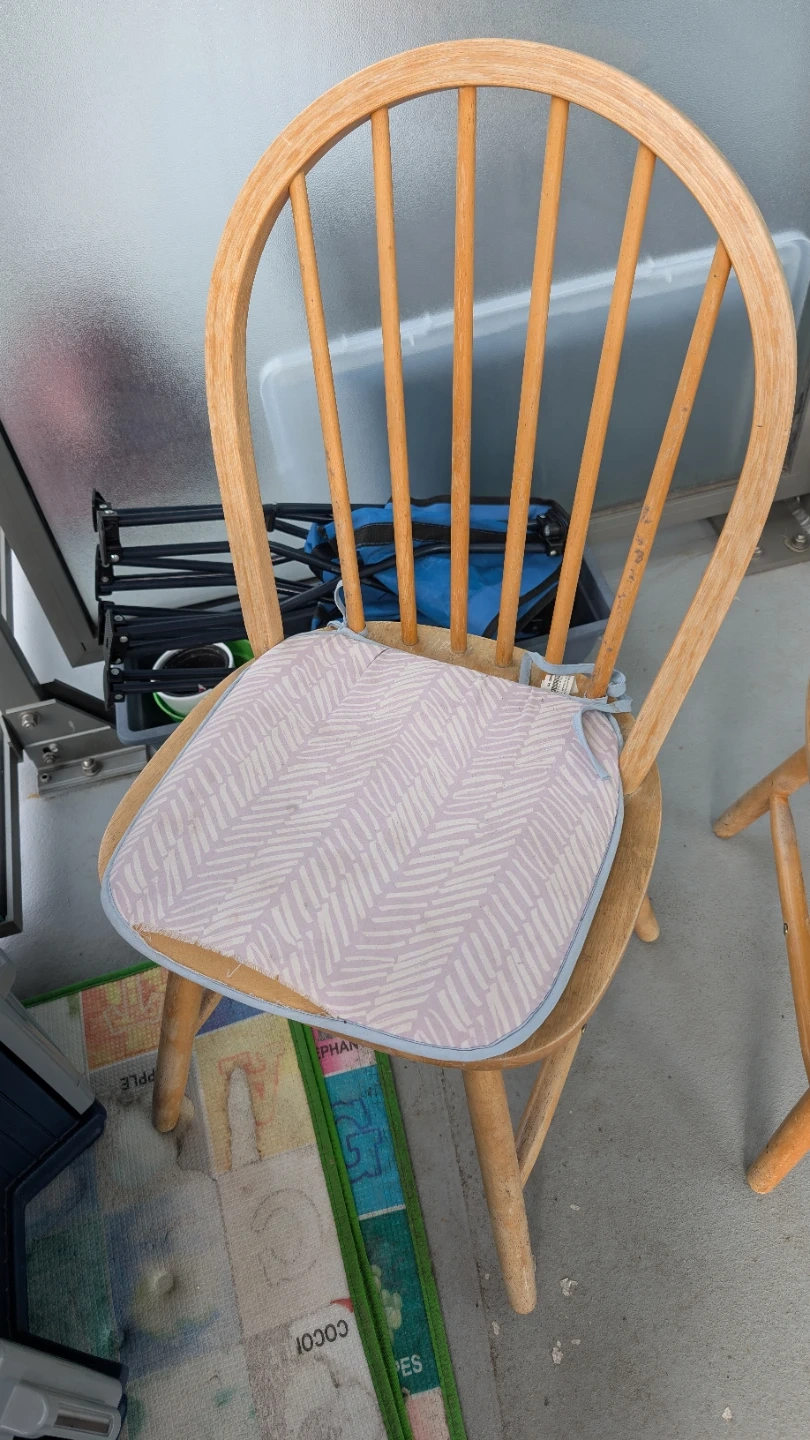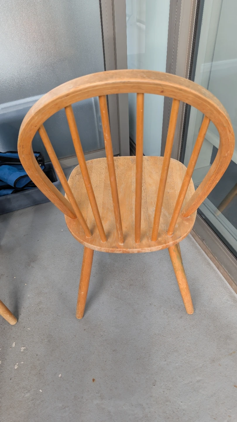 2-Classic wooden spindle back chair, perfect for adding a touch of charm to any room! Comes with a comfy seat cushion featuring a subtle pattern and light blue trim. It's in great shape and ready for a new home