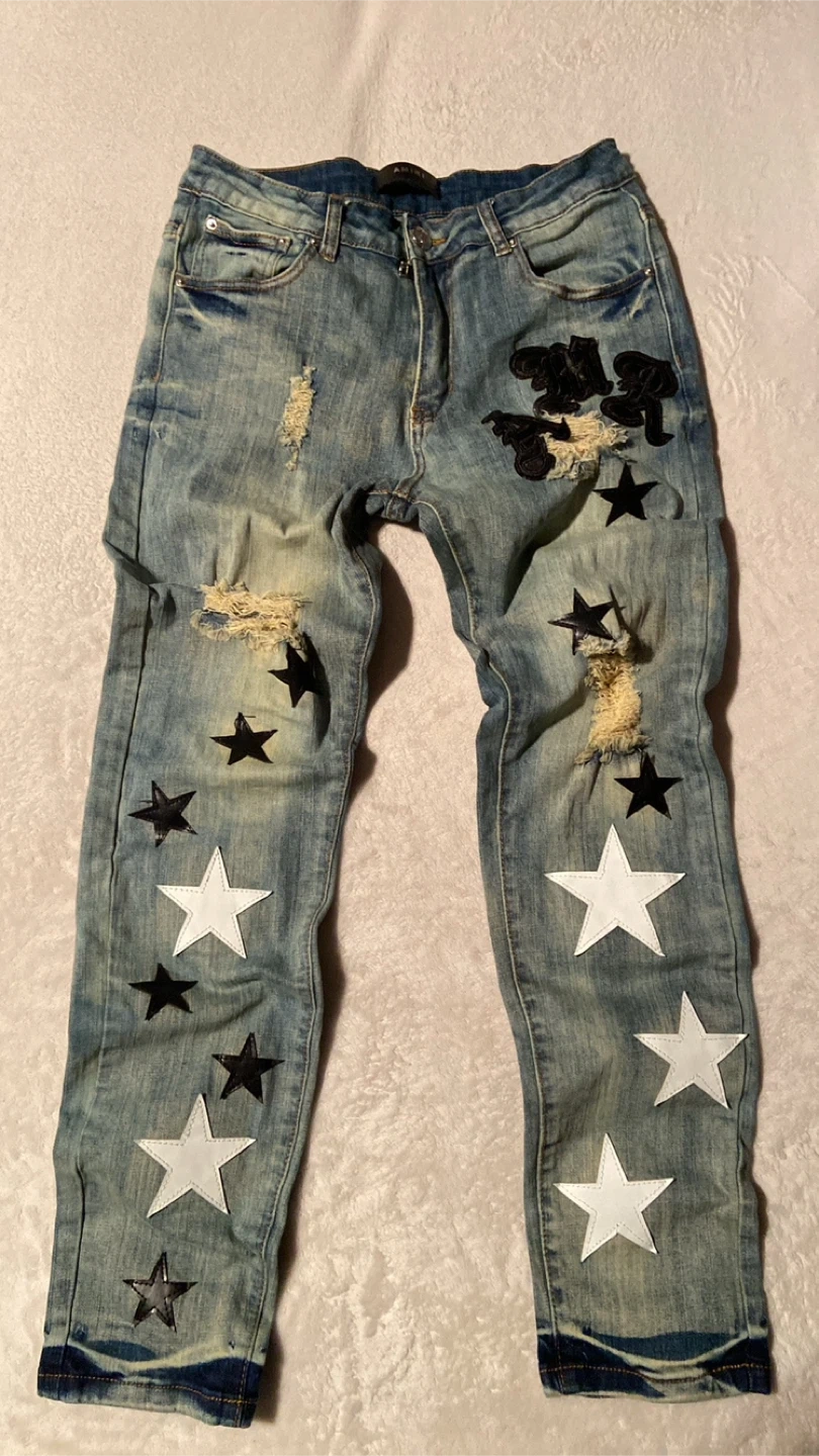 Selling a pair of denim jeans featuring a unique star design. These jeans have a stylish, worn look with some distressed detailing. They're perfect for adding a bit of edge to your wardrobe!