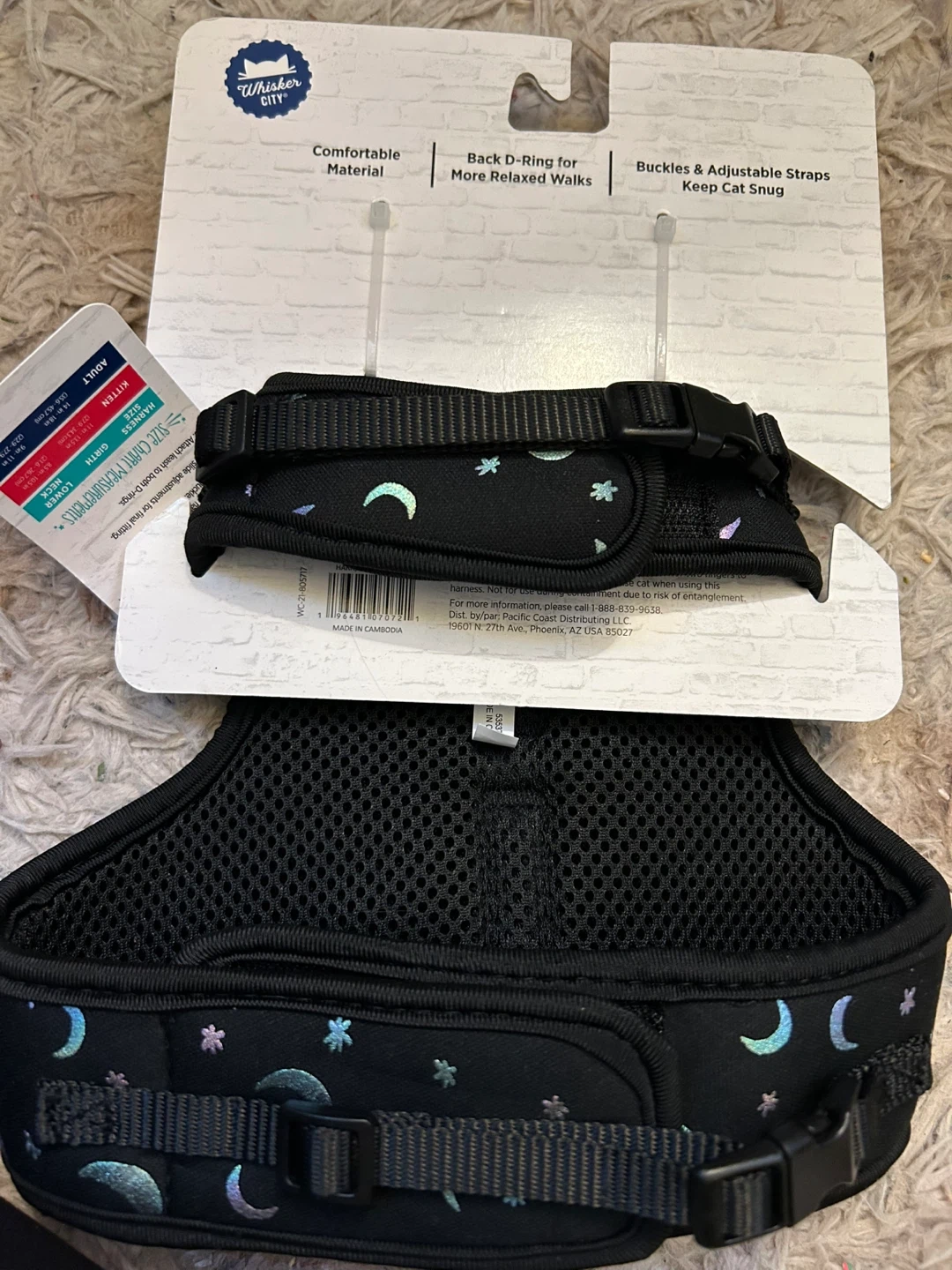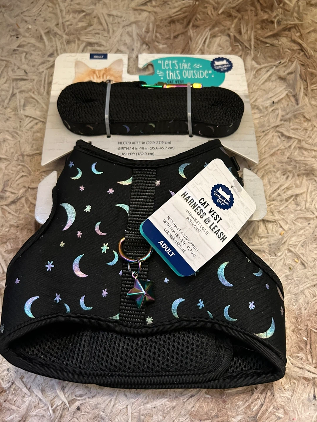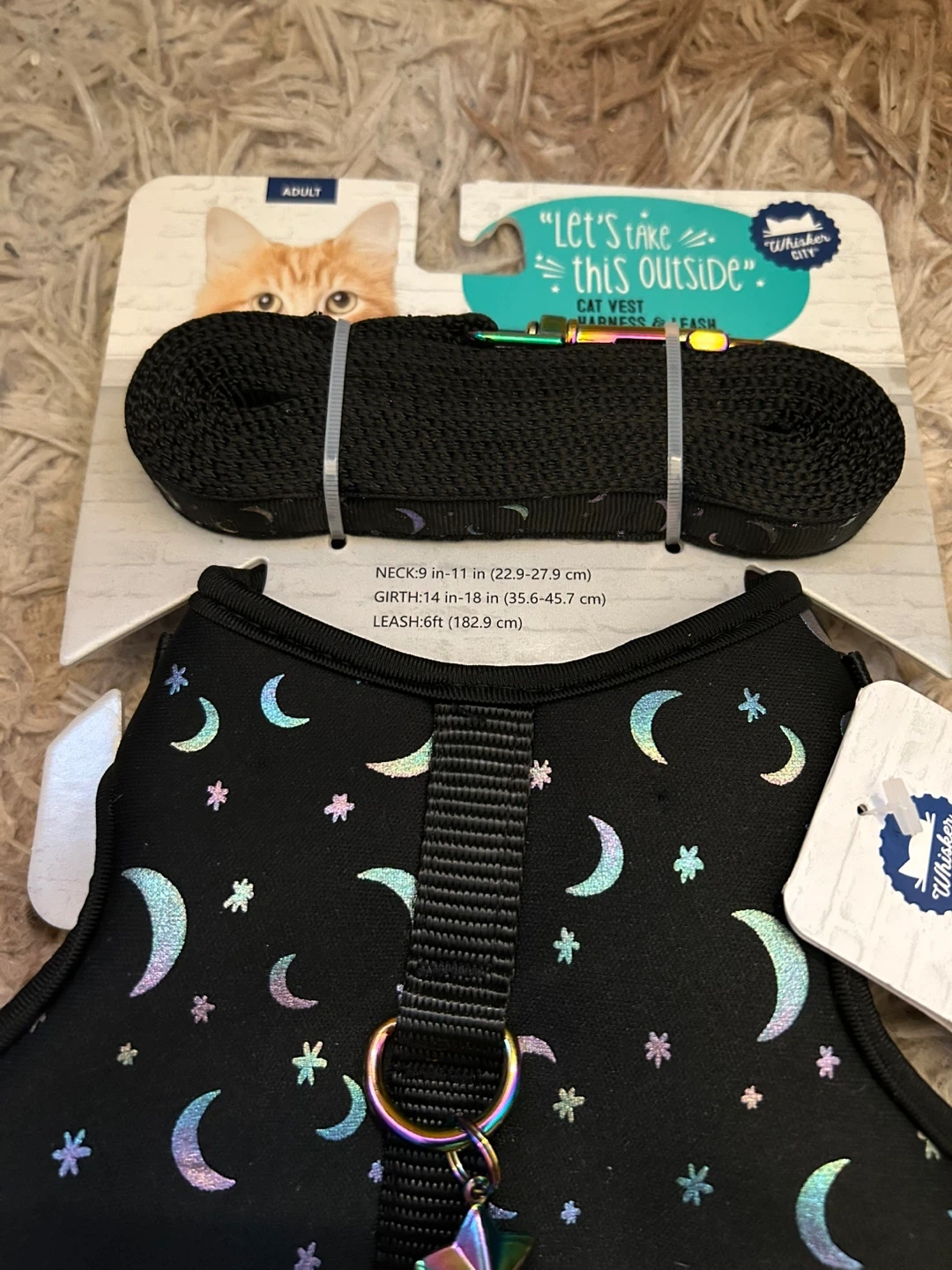 This is a brand new Whiskers City cat harness and leash! It features a comfortable material and a back D-ring for more relaxed walks. The buckles and adjustable straps help keep your cat snug. The neck size is 9-11 inches (22.9-27.9 cm), the girth is 14-18 inches (35.6-45.7 cm), and the leash is 6 feet (182.9 cm)