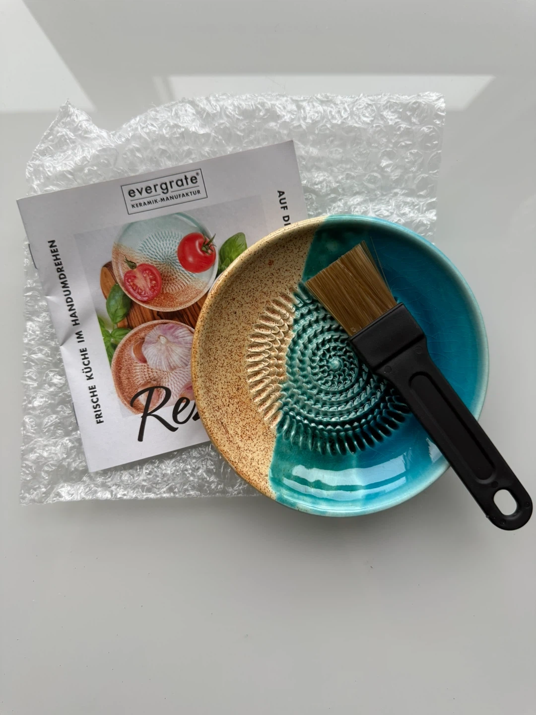 Selling a ceramic grater plate from Evergrate Keramik-Manufaktur! This handy kitchen tool features a unique grating surface and comes with a brush for easy cleaning. Perfect for grating garlic, ginger, Parmesan or other small ingredients right at the table. It's in excellent condition and ready to use!