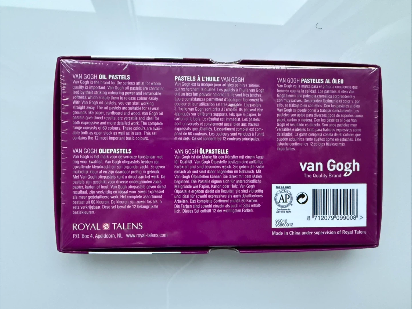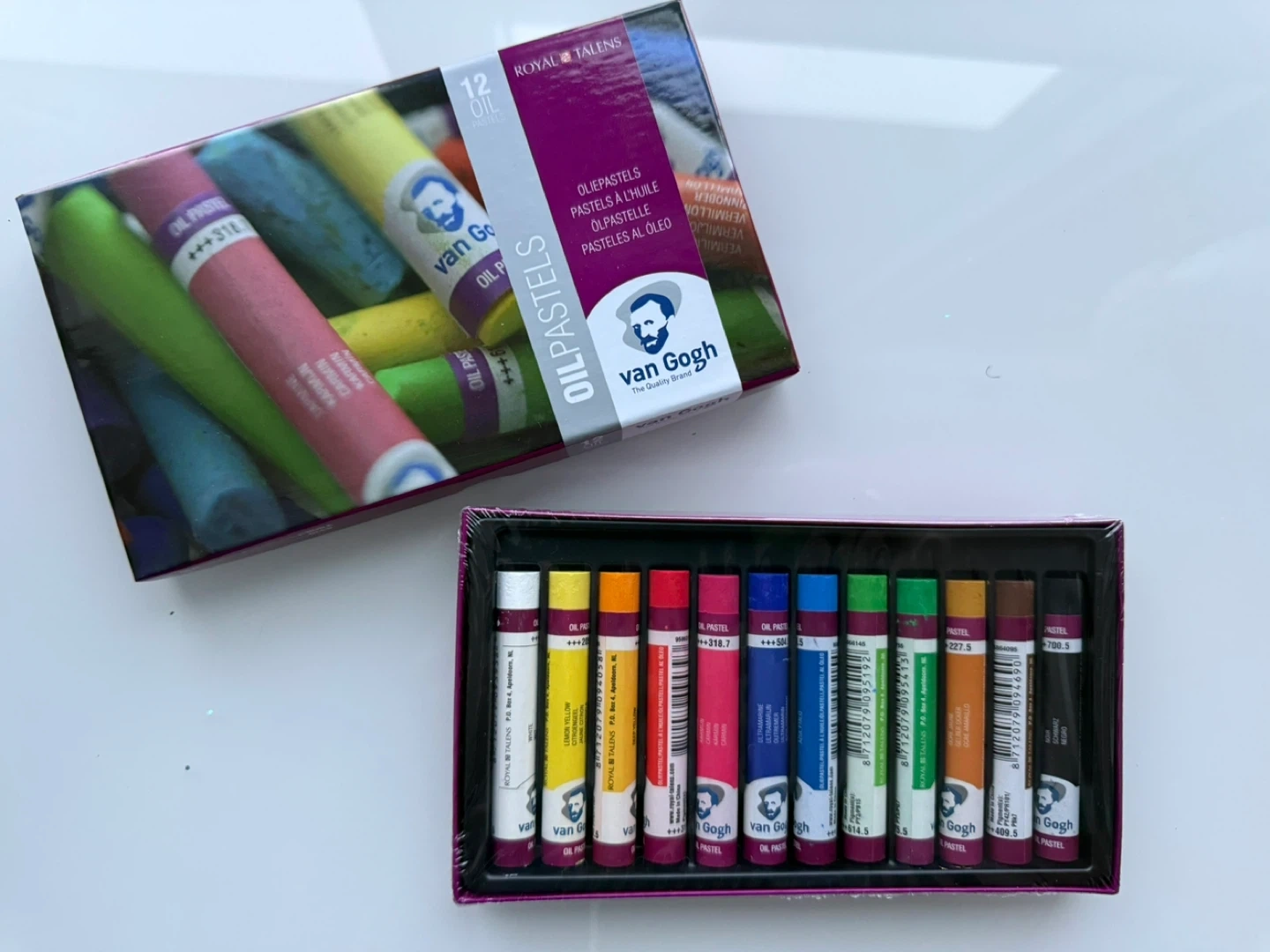 I'm selling a set of Van Gogh oil pastels by Royal Talens! This set contains 12 vibrant colours, perfect for expressive artwork on paper, cardboard, or wood. These oil pastels are known for their striking colour release and remarkable covering power, making them ideal for both beginners and experienced artists