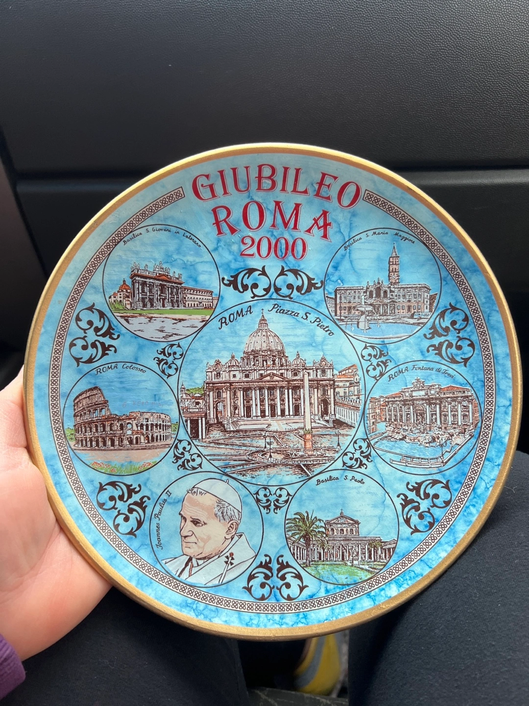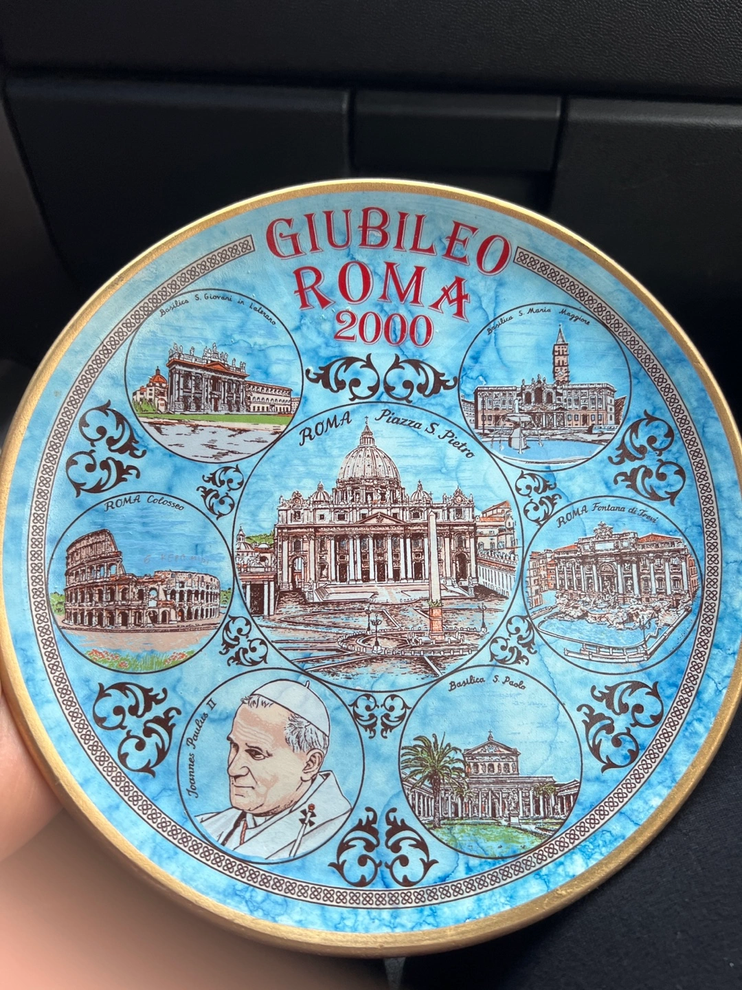 Selling a decorative plate commemorating Giubileo Roma 2000. It features various landmarks of Rome, including Piazza S. Pietro, the Colosseum, and Fontana di Trevi. The plate has a gold-colored rim and is in used condition with some wear and tear on the back