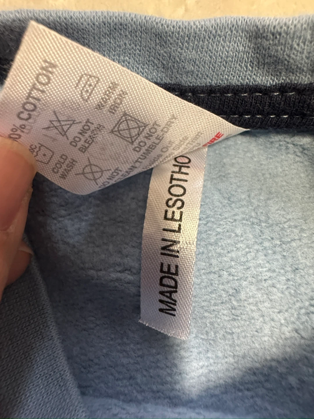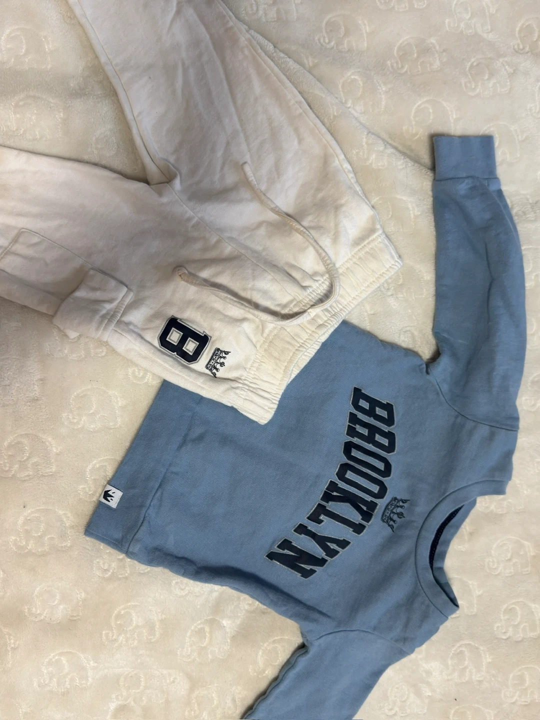 Selling a cute baby outfit set! The top is a light blue sweatshirt with 'BROOKLYN' written across the chest. The pants are white with a 'B' on the side. The size is 12-18 months and it's made of cotton
