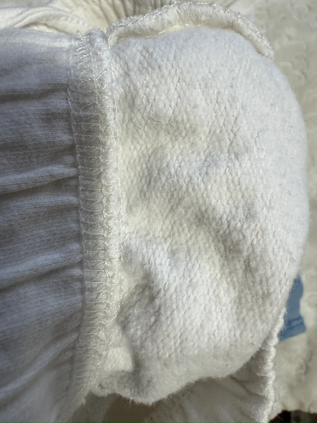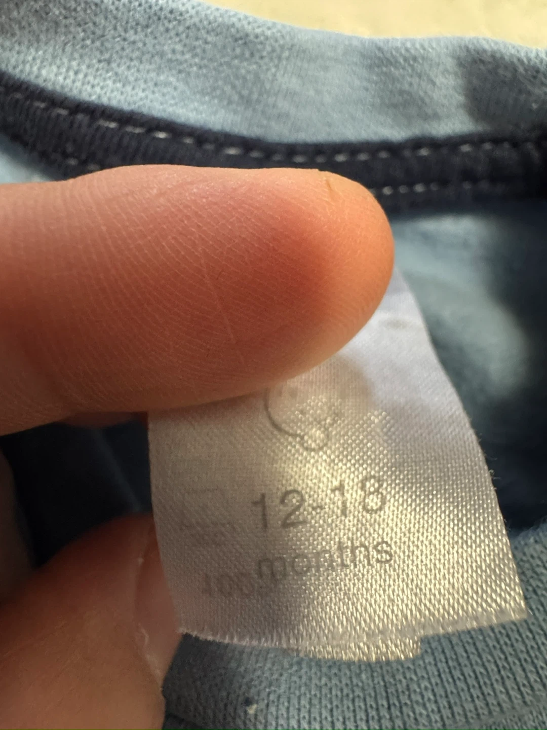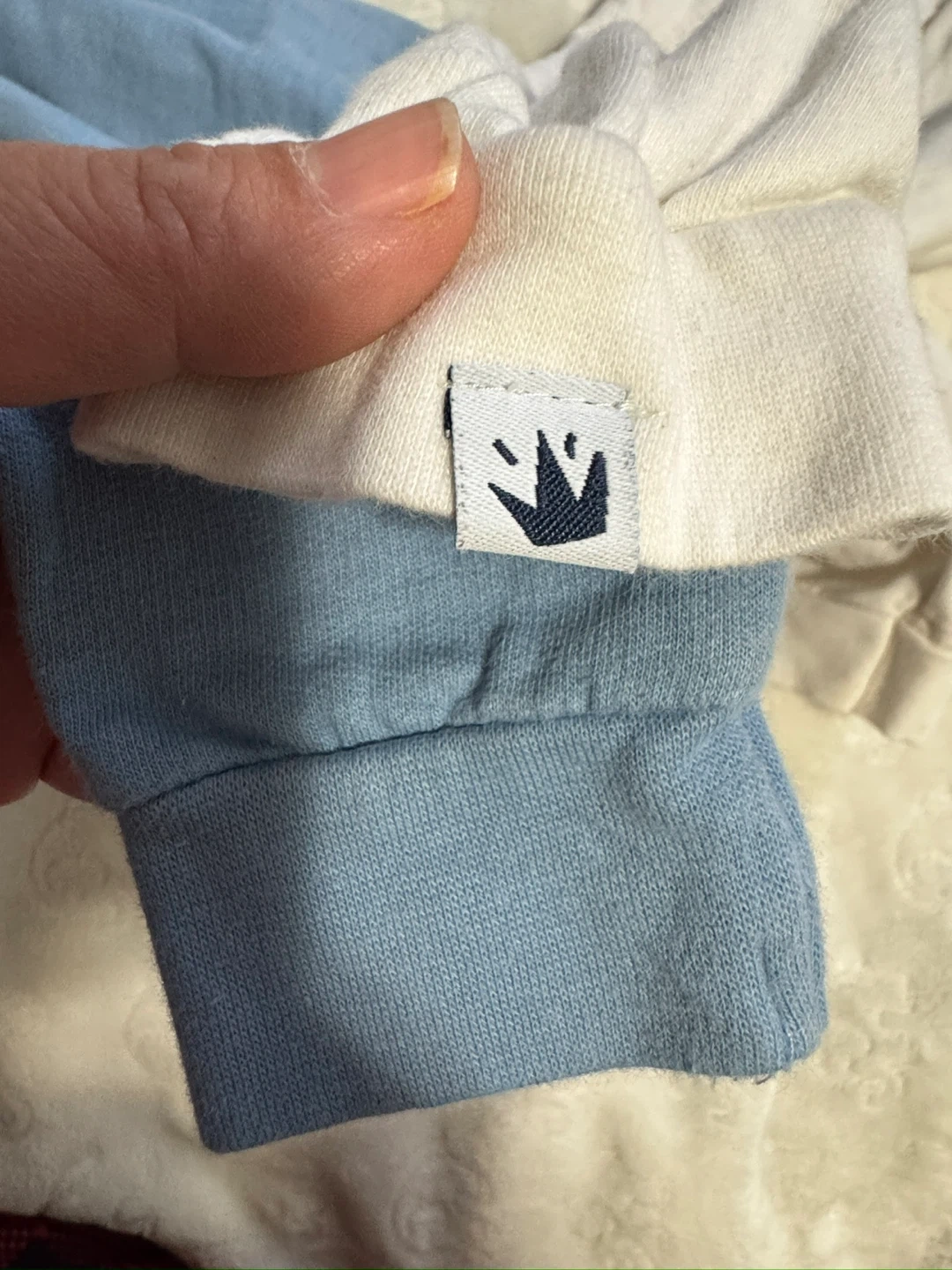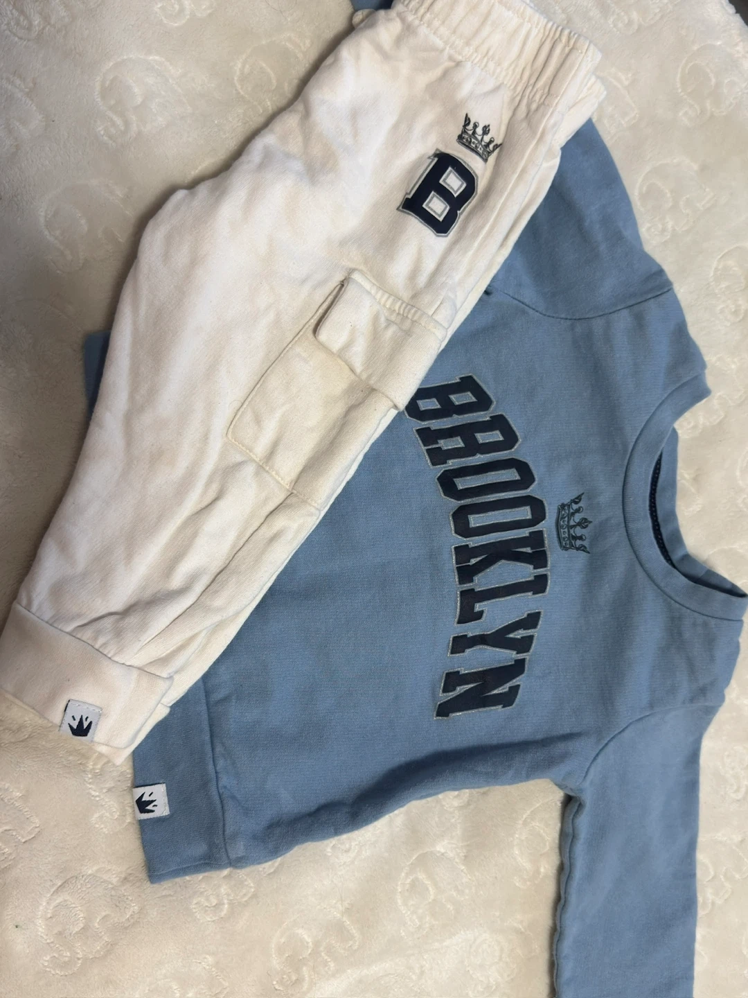 Selling a cute baby outfit set! The top is a light blue sweatshirt with 'BROOKLYN' written across the chest. The pants are white with a 'B' on the side. The size is 12-18 months and it's made of cotton