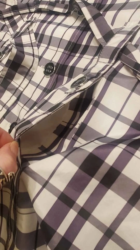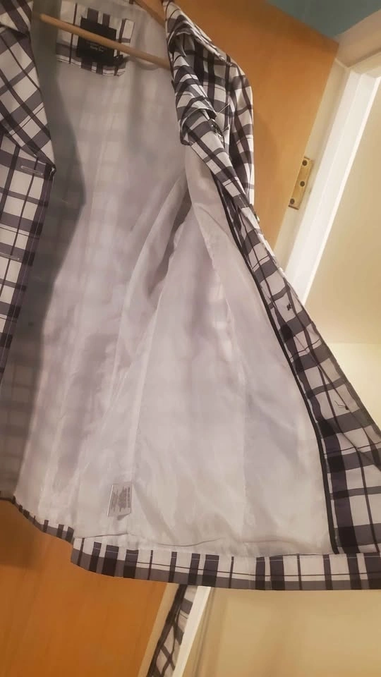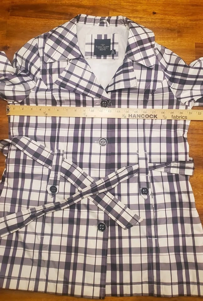 Faded Glory black and white plaid trench coat, rain coat. Includes a waist tie, button details and pockets.