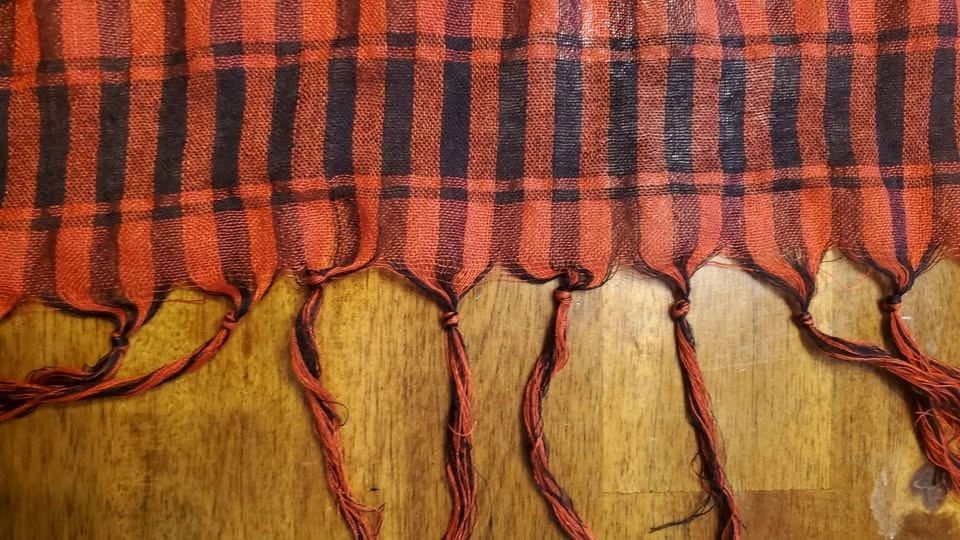Vibrant red and black shawl with fringe accents. Ideal for a bold fashion statement.