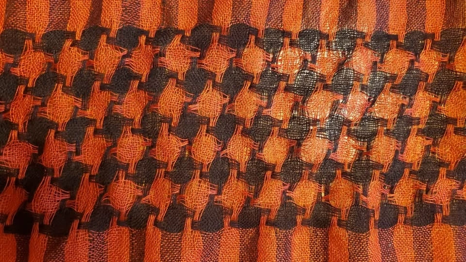 Vibrant red and black shawl with fringe accents. Ideal for a bold fashion statement.