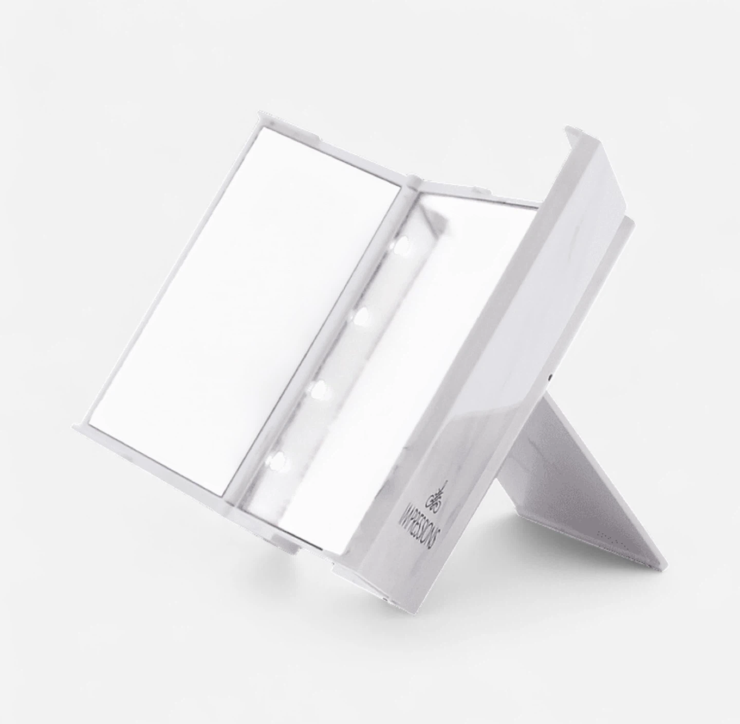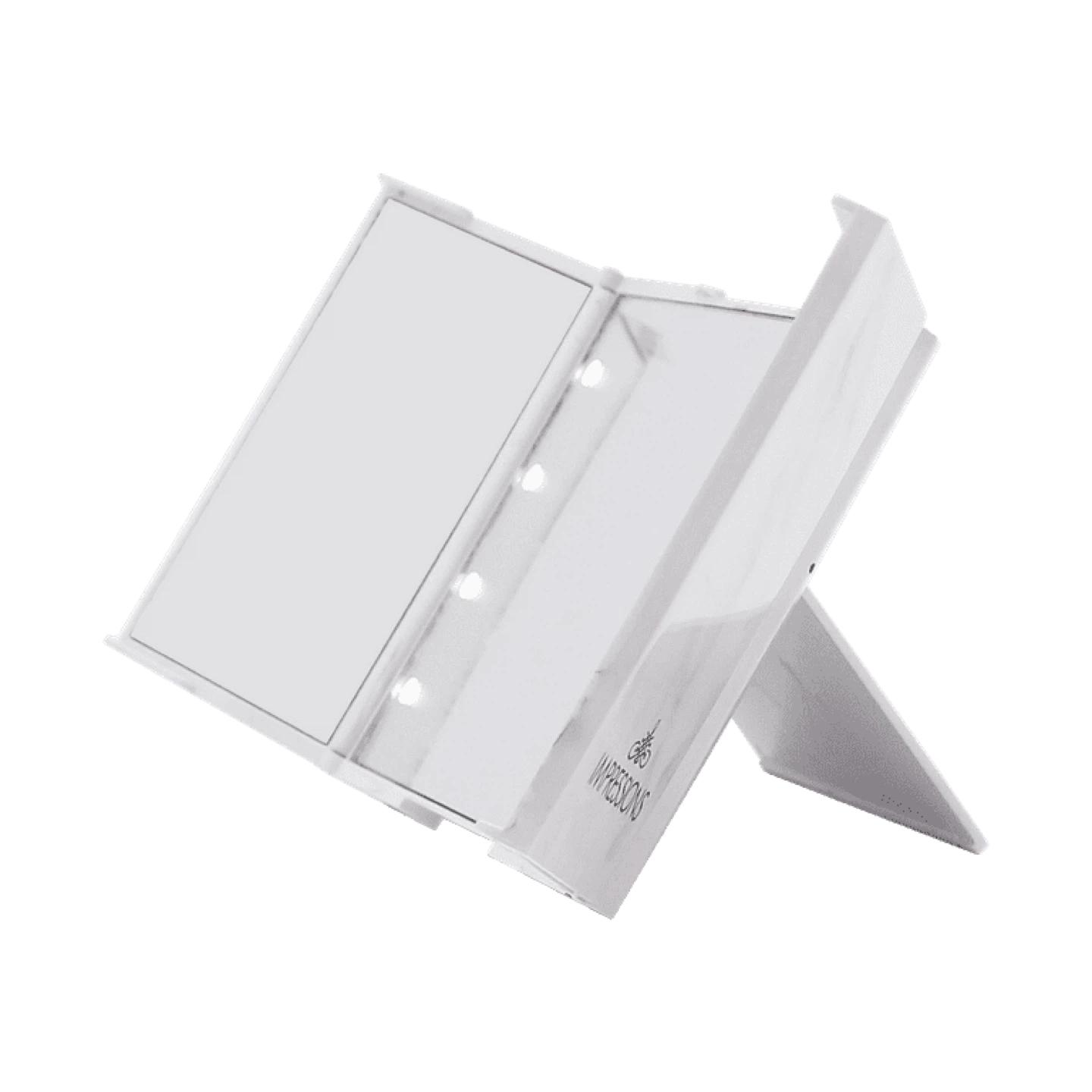 Work your angles like a pro on the go with the Impressions Vanity ReveaLight™ Trifold Compact Mirror! With a push of a button, bright LED lights flood the three mirrors, bathing your face in light from all sides. With this mighty compact, you can be sure that you are always putting your best face forward