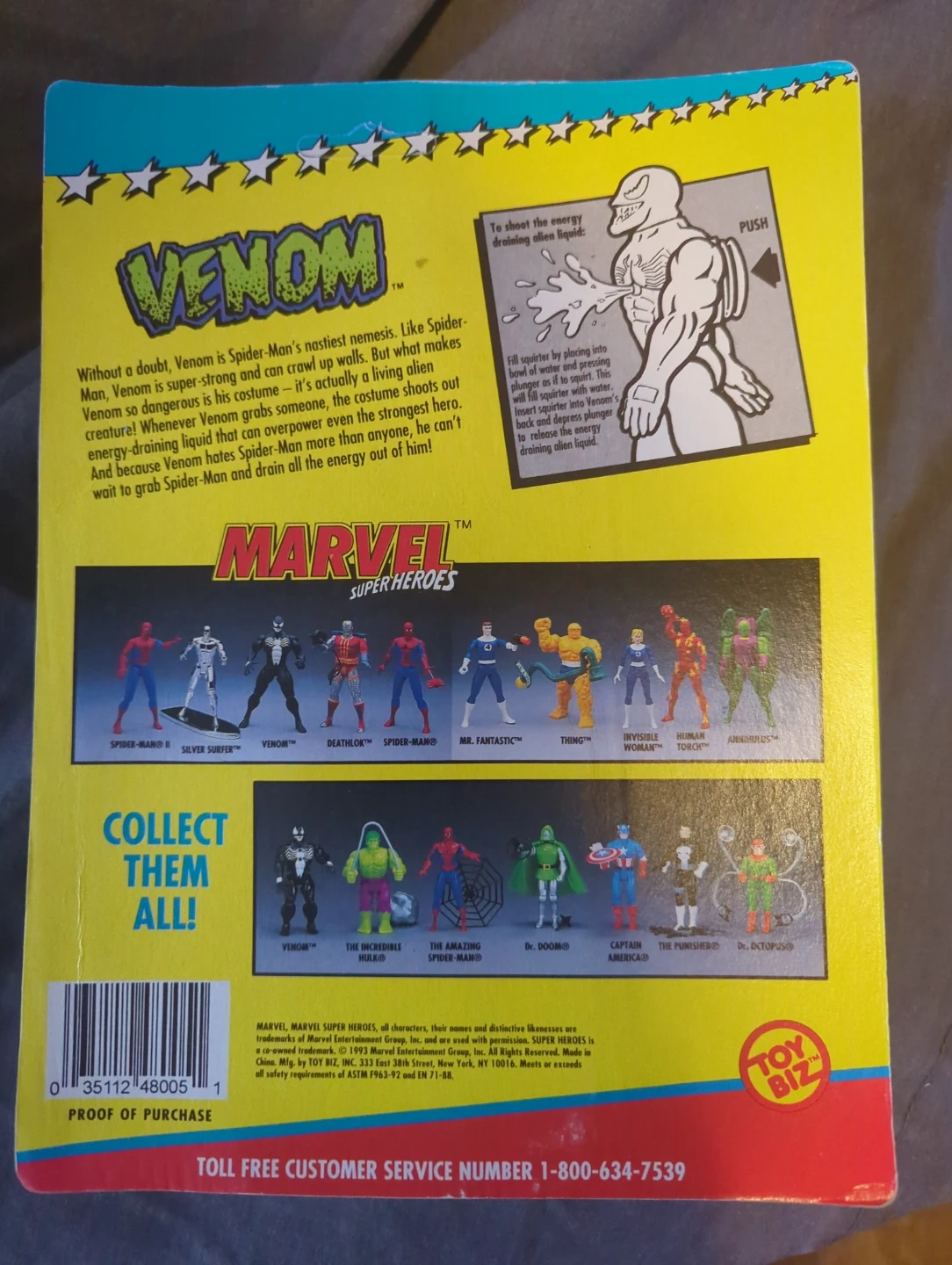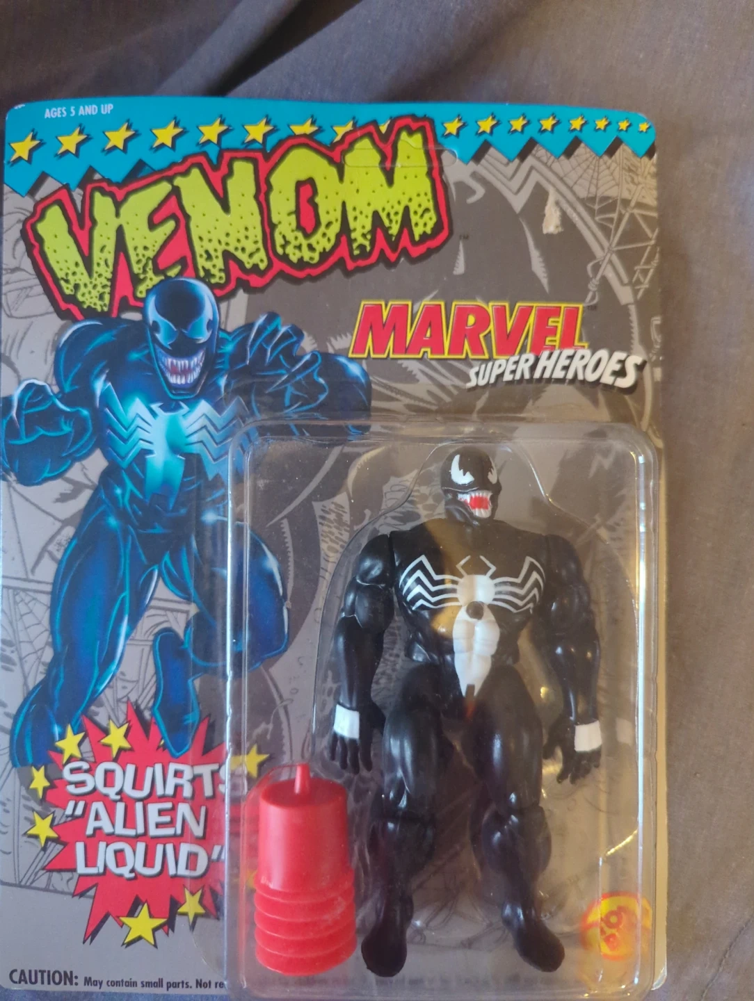 Selling a brand new, in-box Marvel Super Heroes Venom action figure! This figure is from Toy Biz and features Venom with his squirt alien liquid action. A cool collectible for any Marvel fan 1993 with shelf tab in place