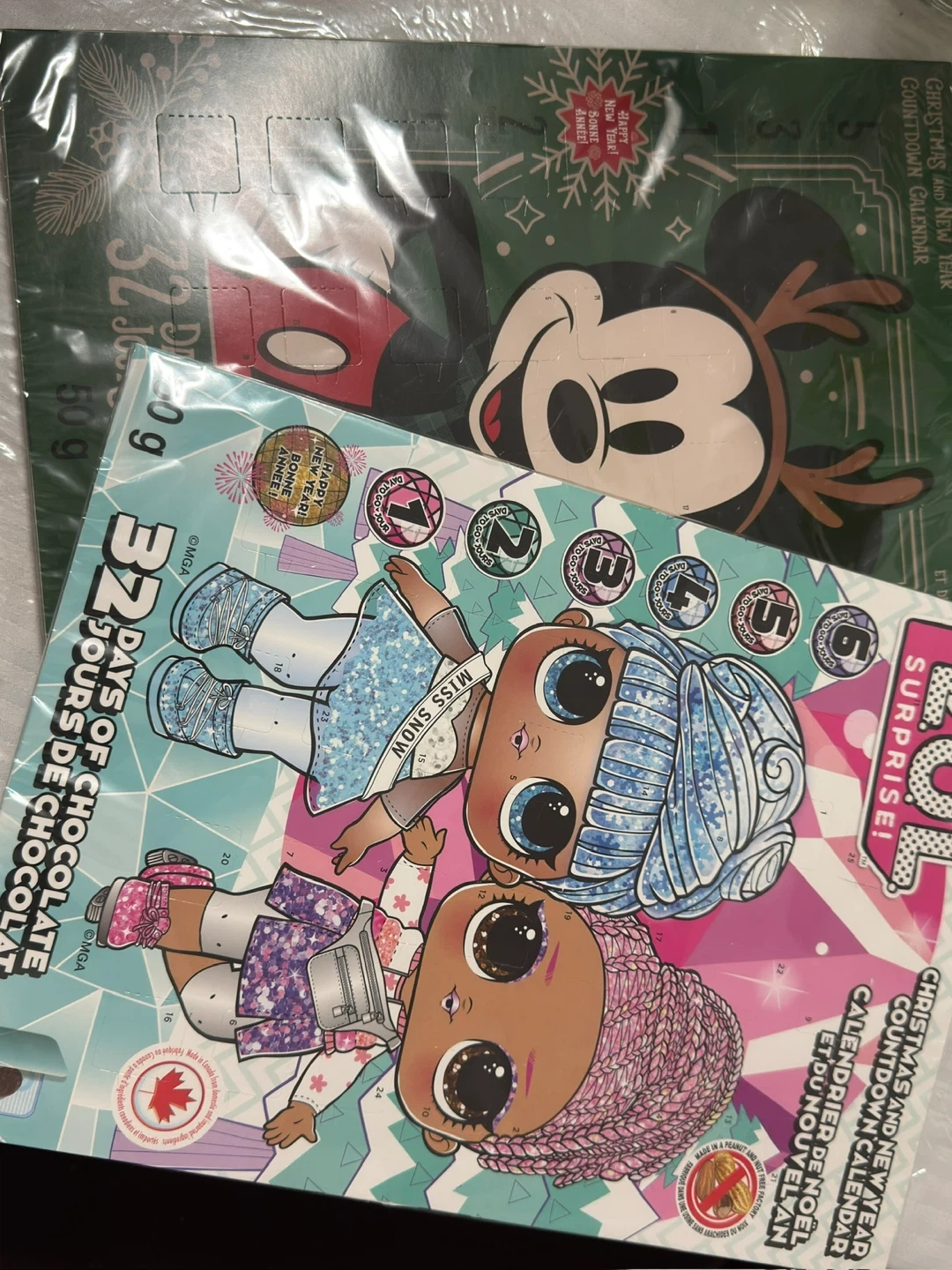 I have two brand new chocolate advent calendars for sale: one LOL Surprise! and one Disney Christmas themed. Both calendars have 32 days of chocolate and expire in July 2028. Perfect for the holidays!