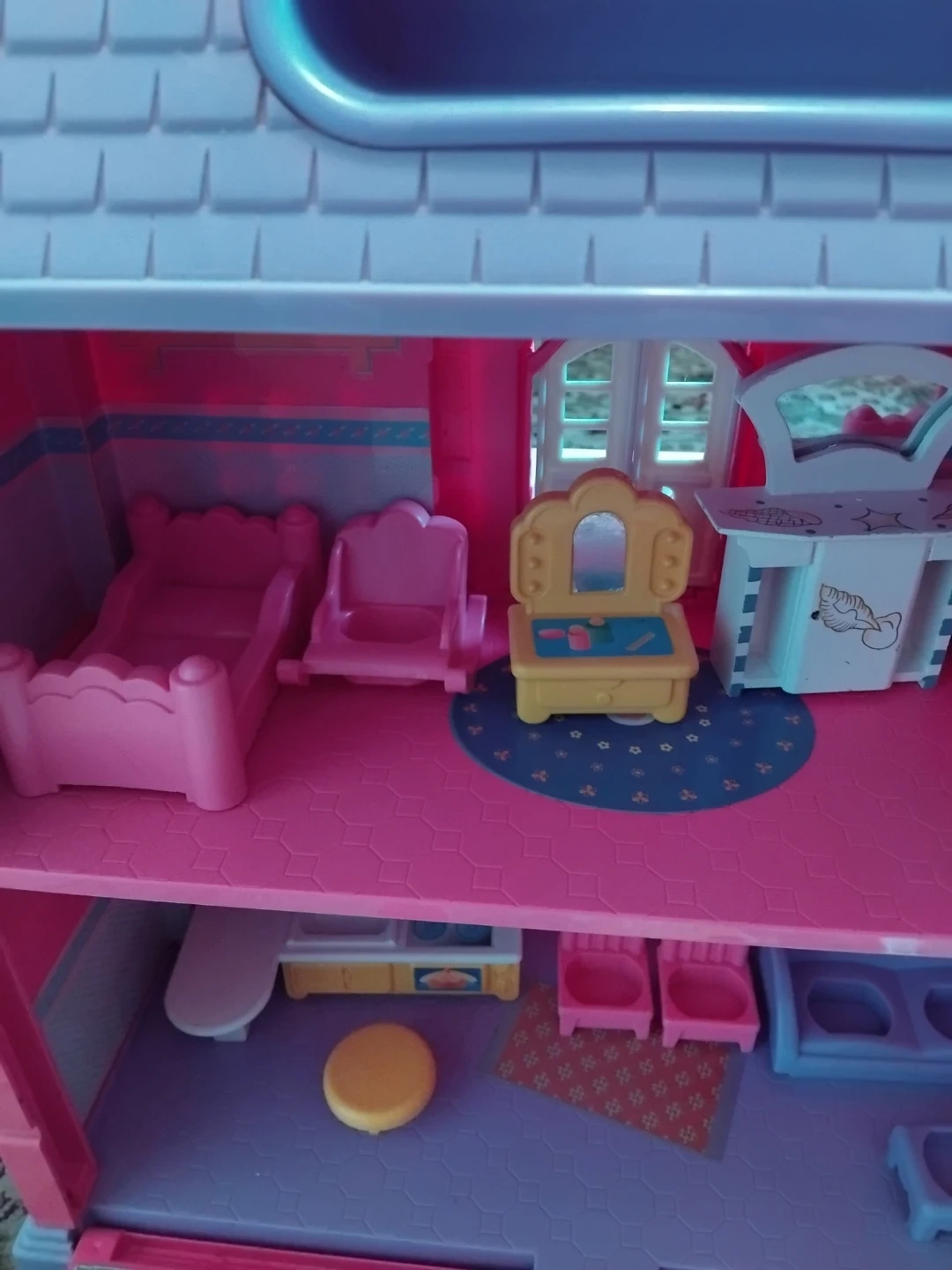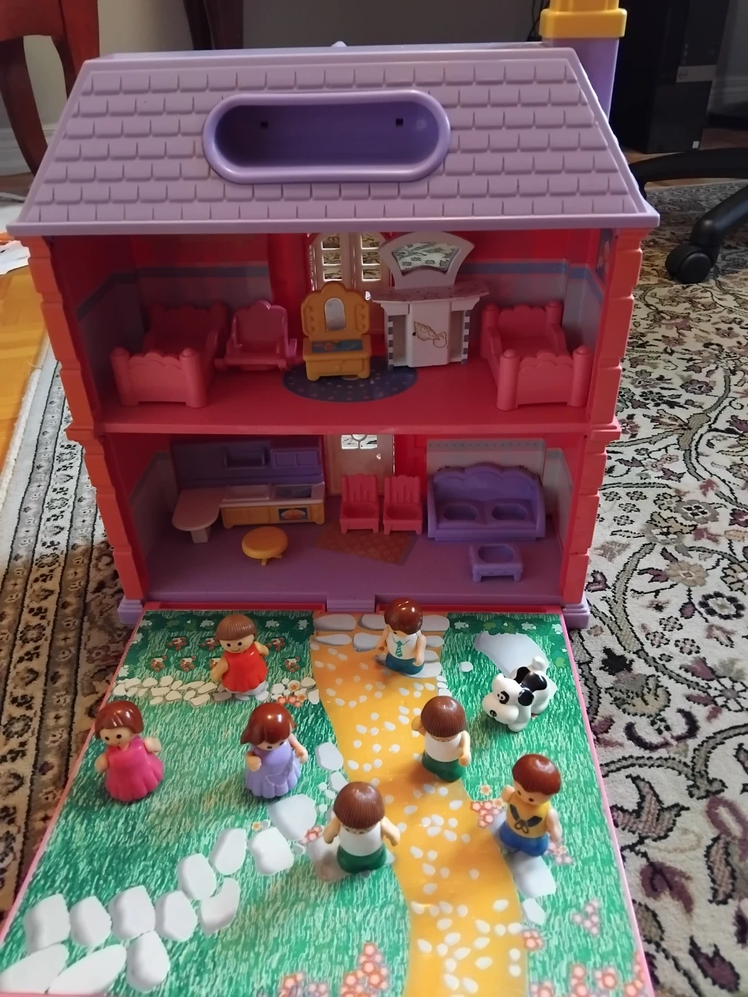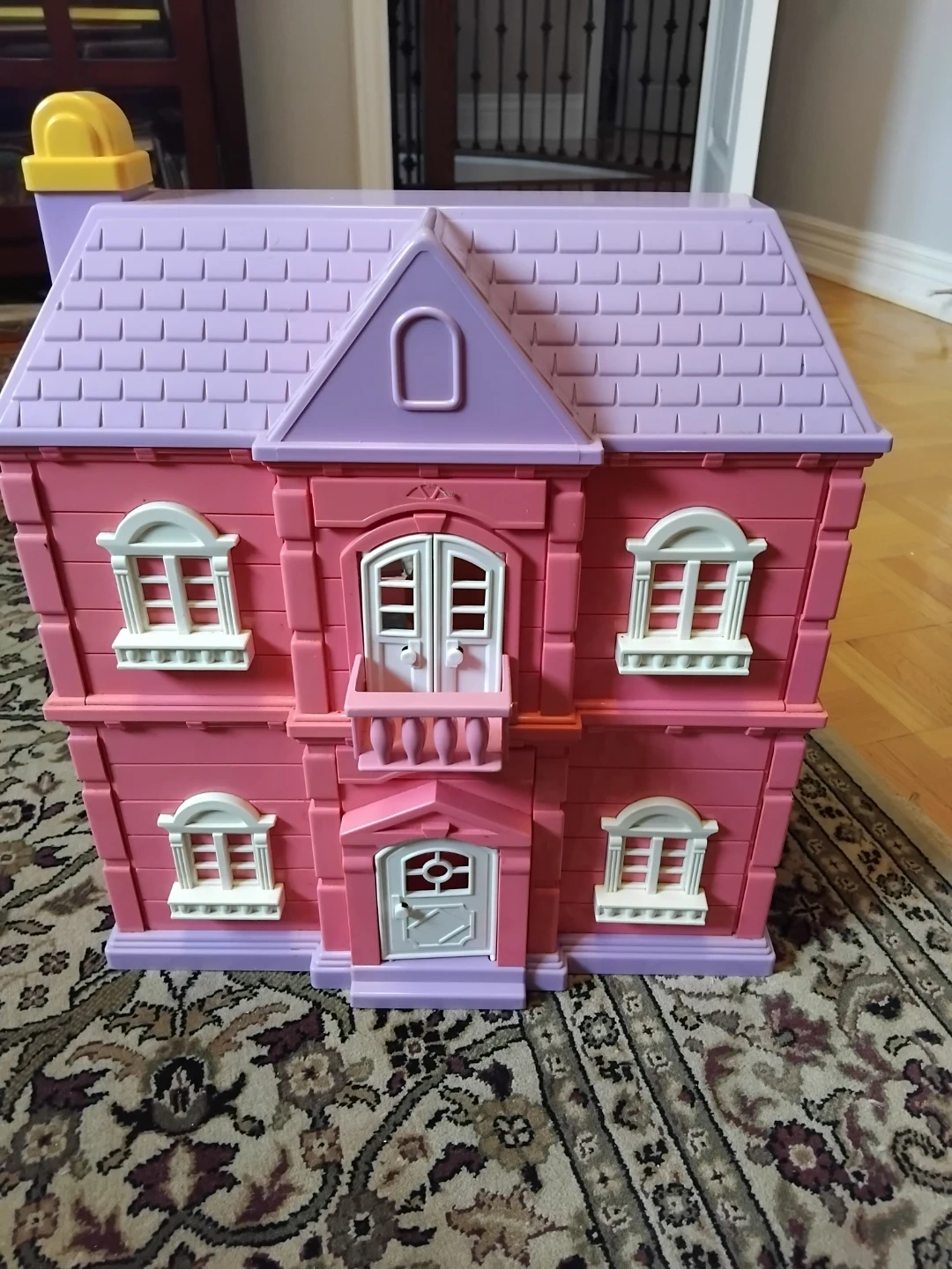 Selling a dollhouse that comes with furniture and figures. It features a pink and lavender colour scheme. Perfect for imaginative play!