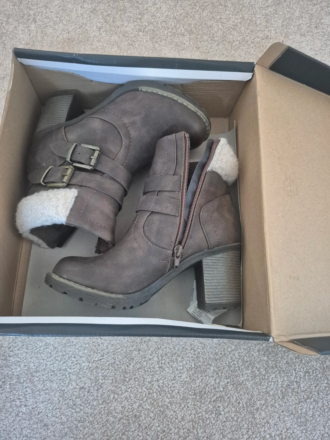 These cute brown heeled ankle boots are in great condition and ready for a new owner! They feature a side zipper and buckle detail, with a cozy faux fur lining. They come in the original box and are a size 5.
