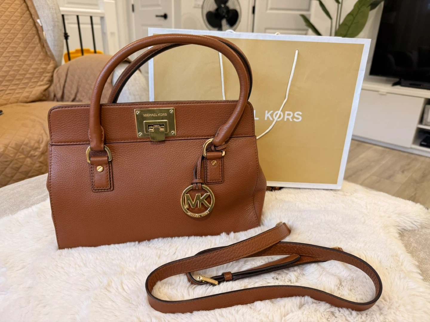 A beautiful brown Michael Kors satchel bag! It's in great shape and ready for a new owner. The bag features a gold-tone logo and hardware. Originally bought for $329!