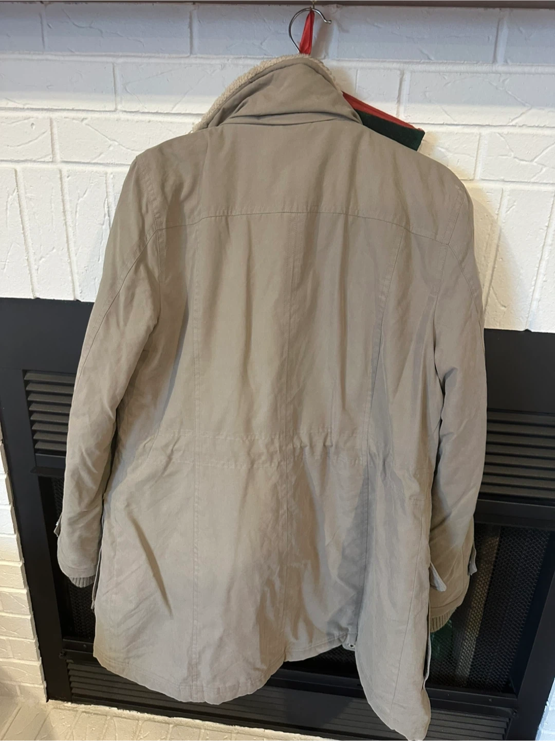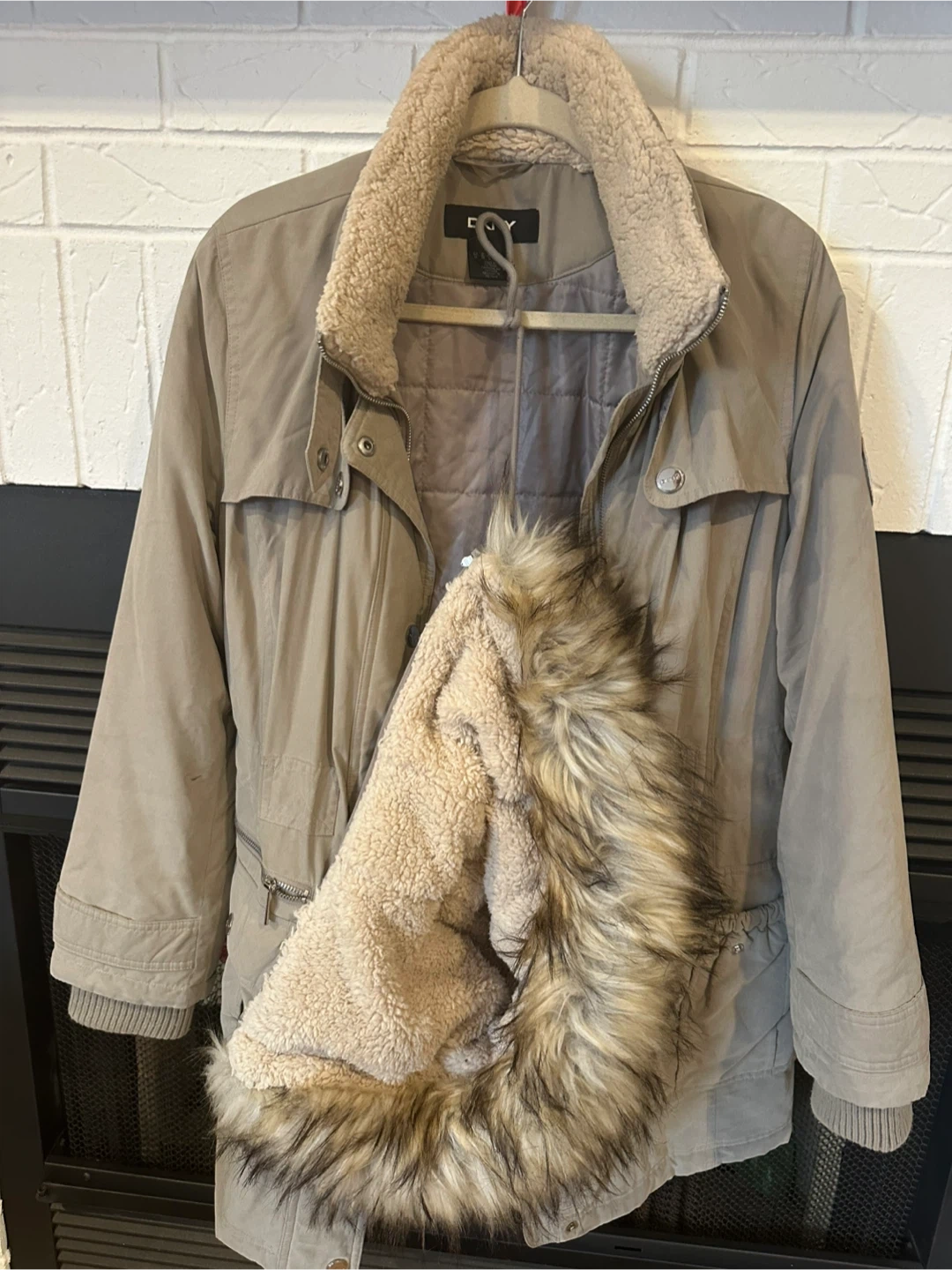 Here's a DKNY winter coat in a neutral beige colour. It features a cozy faux fur lining and a removable faux fur trim on the hood. Perfect for staying warm during the colder months!