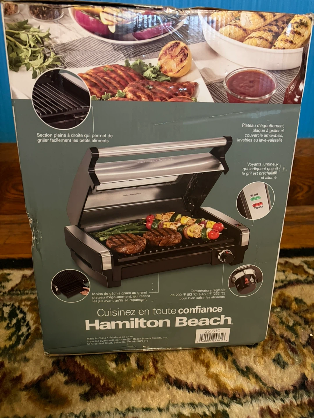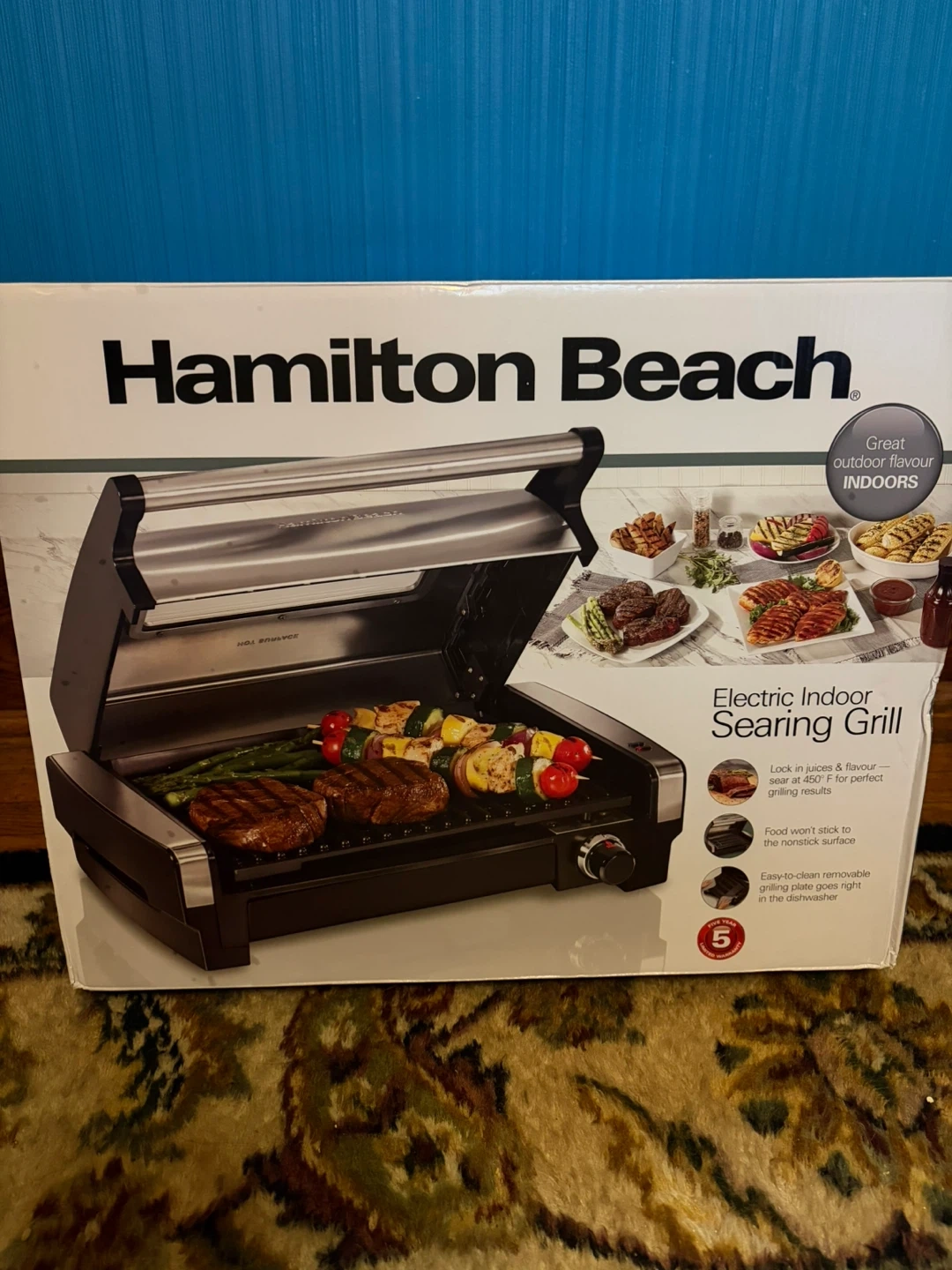 Get ready to enjoy great outdoor flavour indoors with this Hamilton Beach electric indoor searing grill! It locks in juices and flavour, searing at 450°F for perfect grilling results. Food won't stick to the nonstick surface, and the easy-to-clean removable grilling plate goes right in the dishwasher.