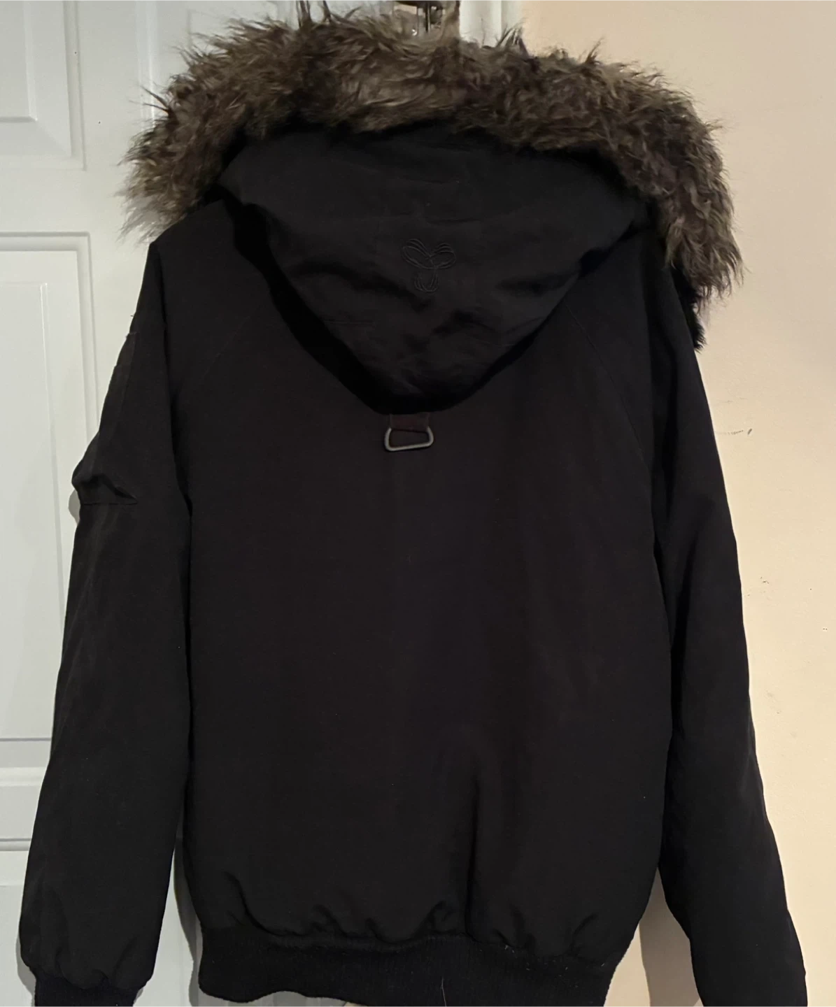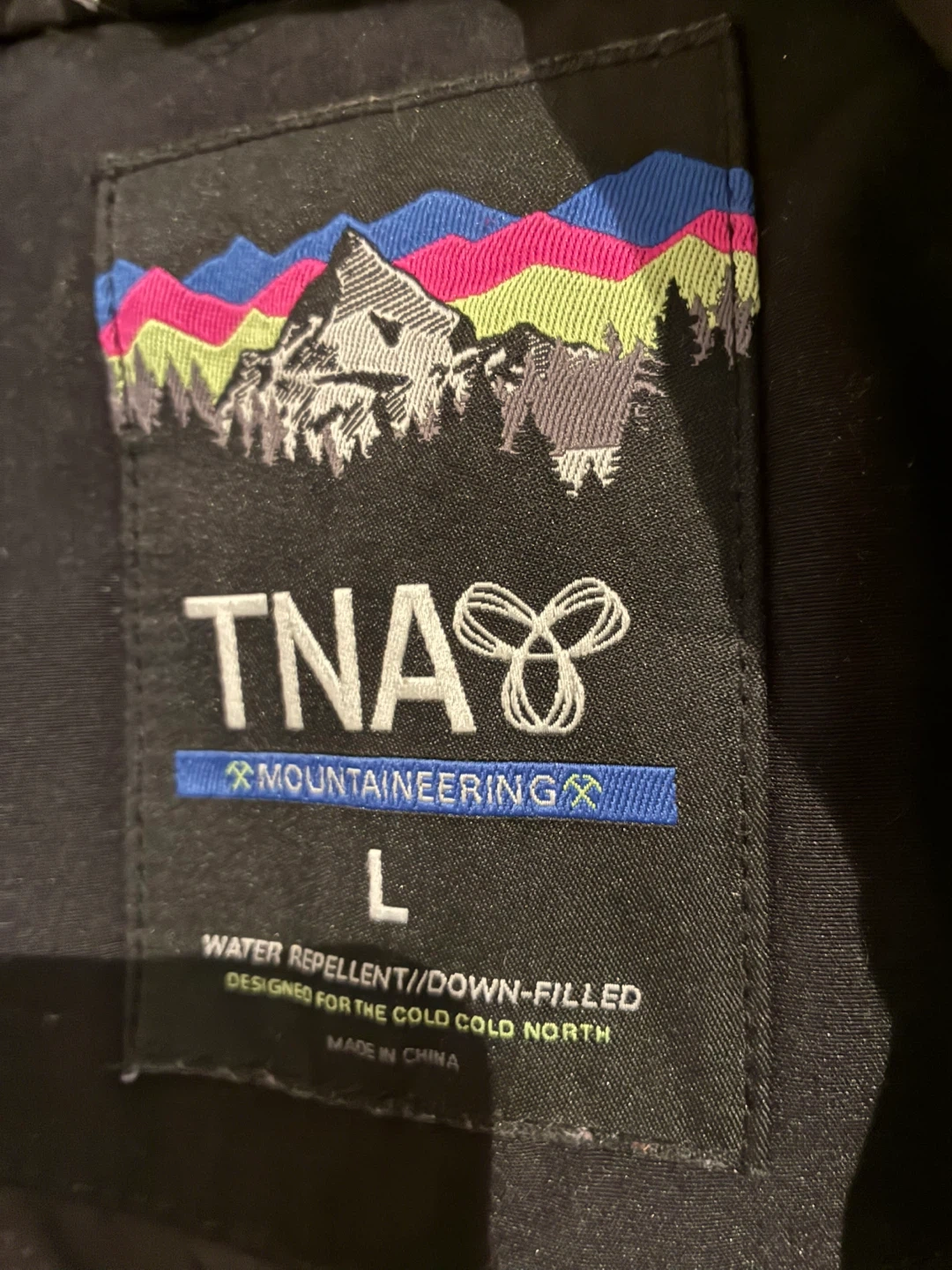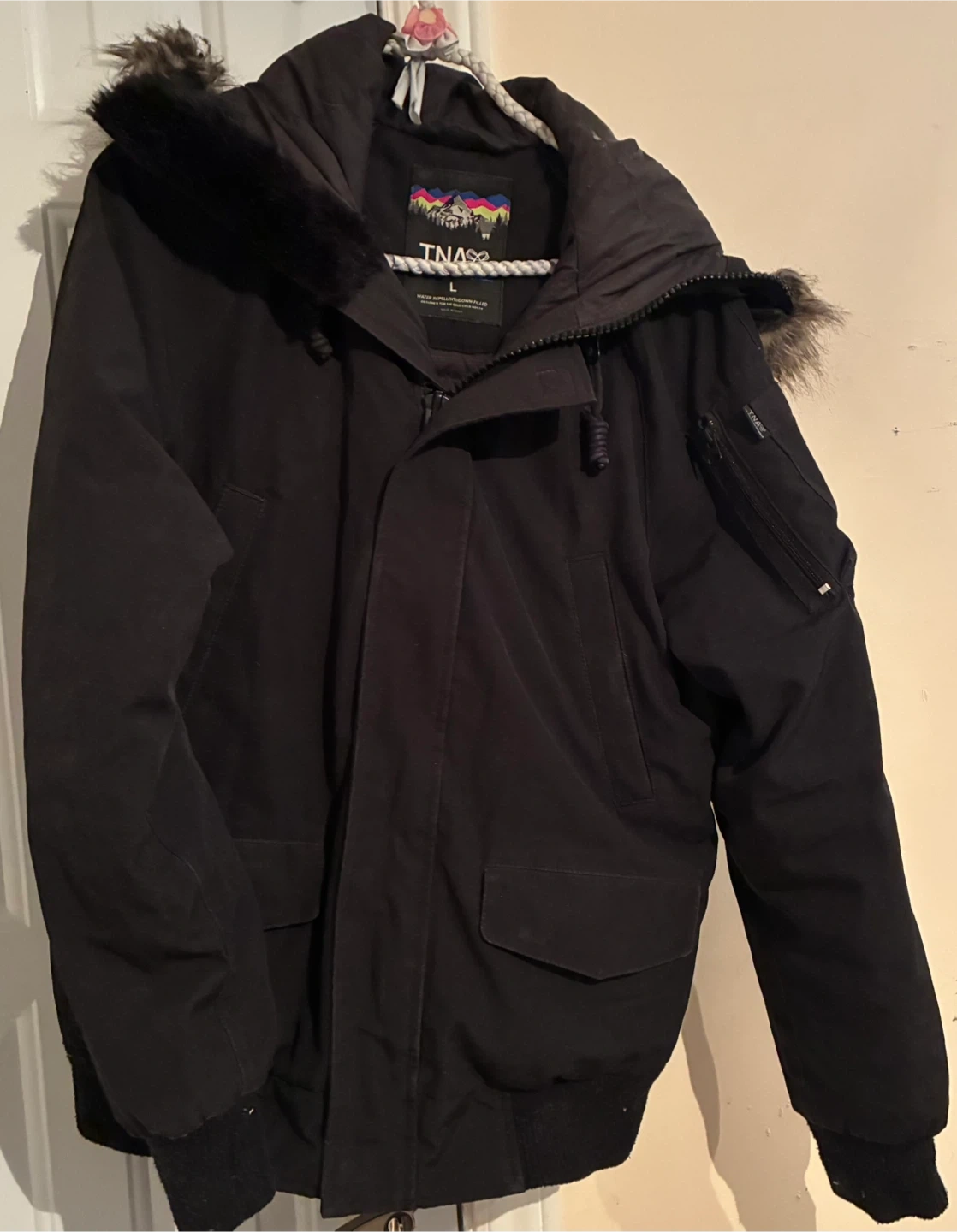 Selling a TNA Mountaineering parka in black, size large. It's water repellent and down-filled, perfect for the cold Canadian winters! Has a faux fur trim on the hood and lots of pockets
