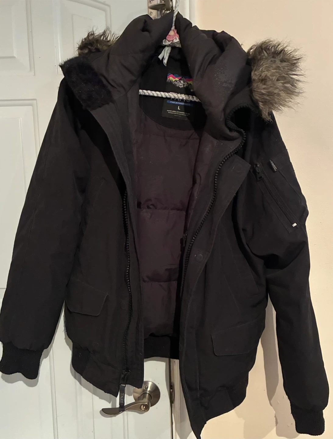 Selling a TNA Mountaineering parka in black, size large. It's water repellent and down-filled, perfect for the cold Canadian winters! Has a faux fur trim on the hood and lots of pockets