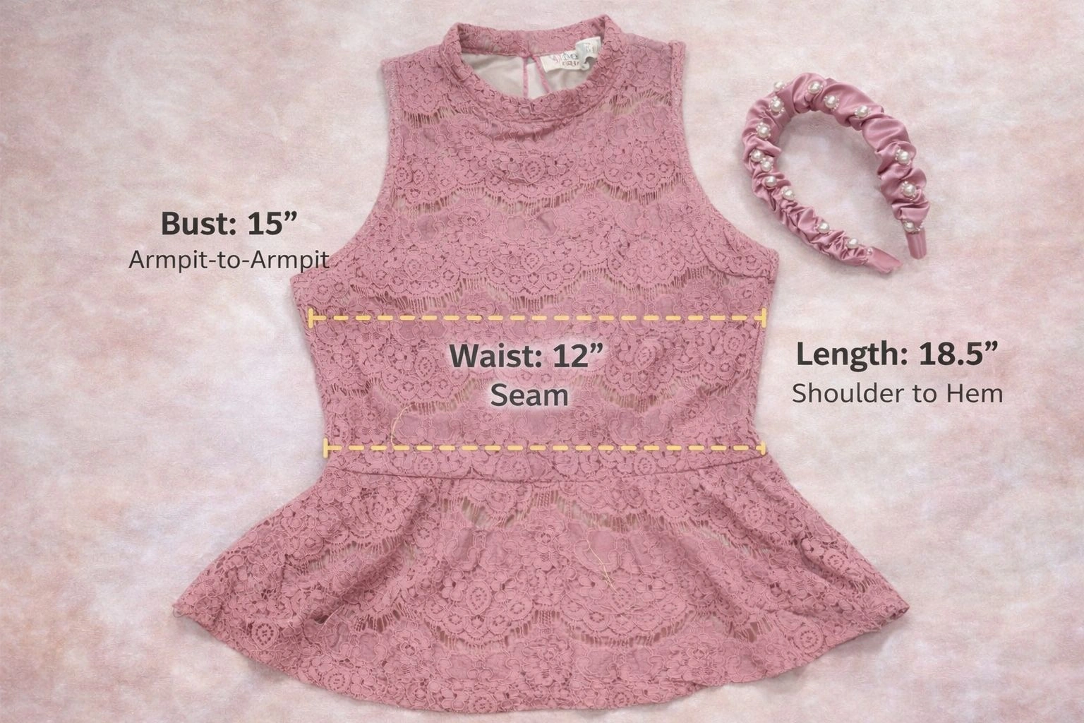 Bundle includes: Lace peplum top and scrunchie pearl satin headband. Super cute look!