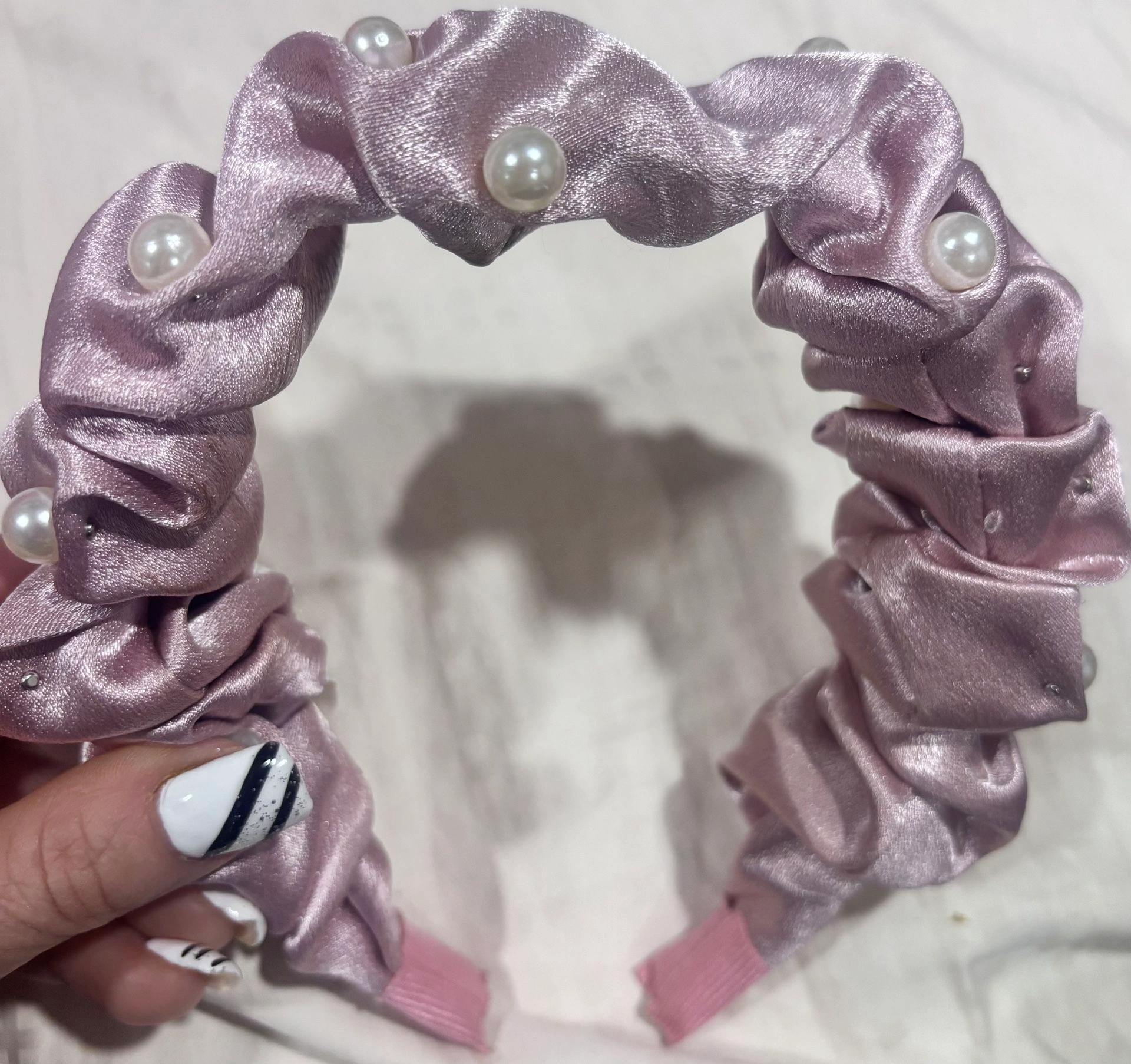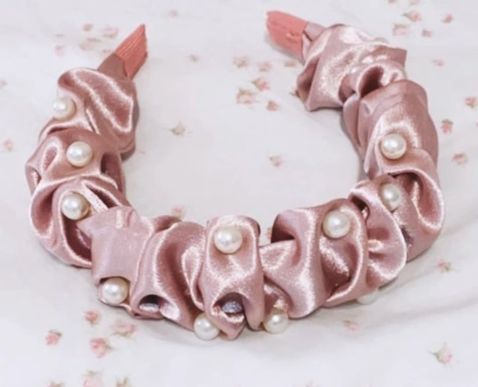 Headband: Scrunchie-style satin headband with pearl accents in a matching mauve tone. Comfortable and flexible fit.