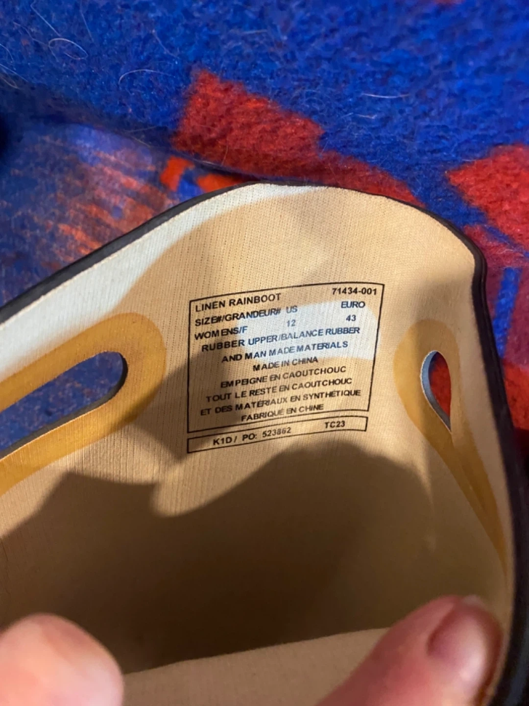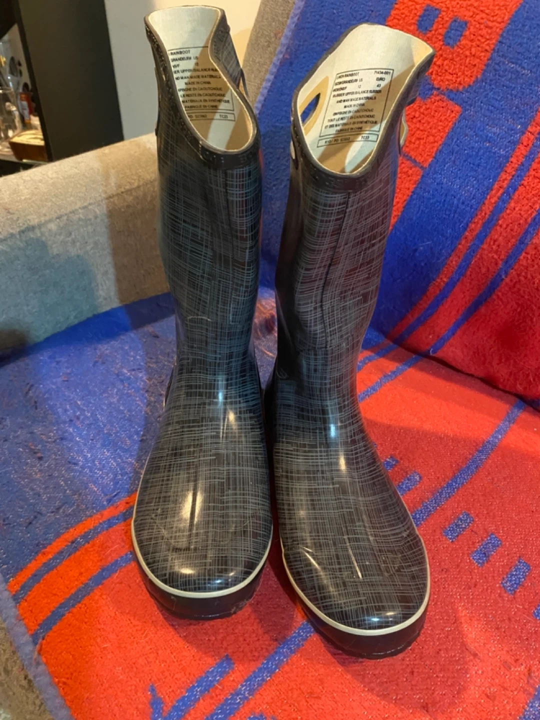 Selling a pair of Bogs Linen Rainboots in women's size 12. Never worn. These rainboots are made with a rubber upper and balance of rubber, and man-made materials. They're in great shape and ready for the rainy season!