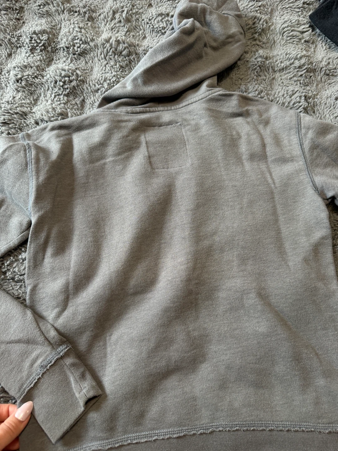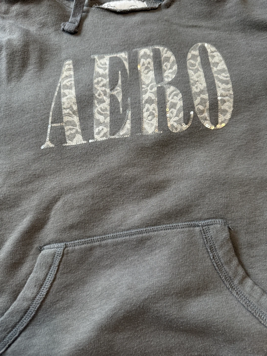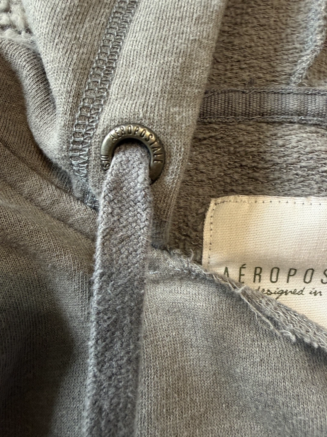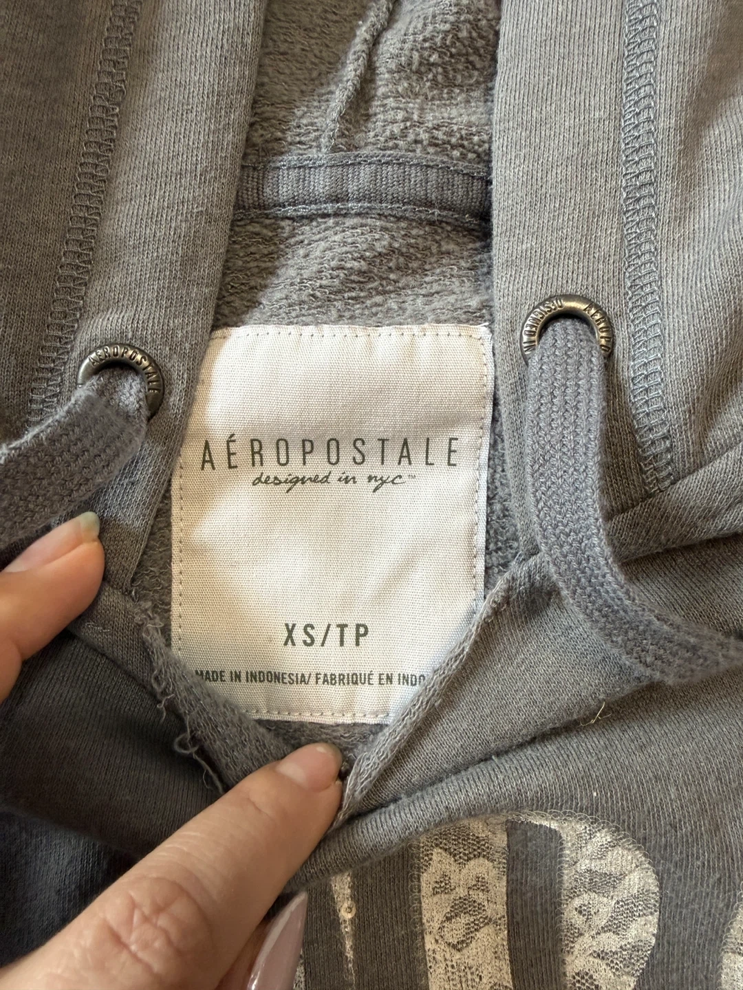 Selling a gently used Aeropostale grey hoodie in size XS. It's in great condition and ready for a new owner! The hoodie features the 'AERO' logo on the front. Perfect for casual wear