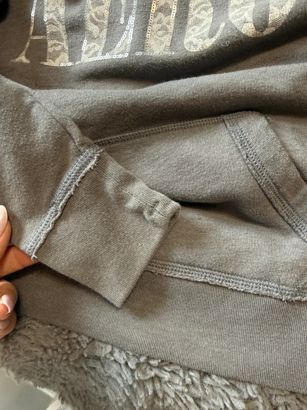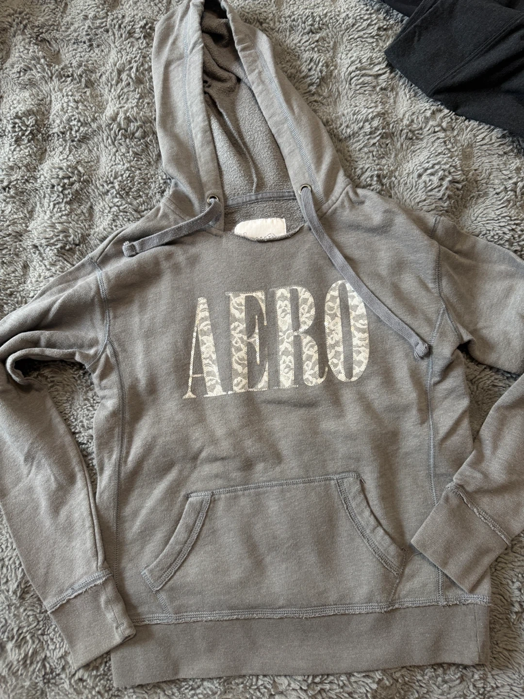 Selling a gently used Aeropostale grey hoodie in size XS. It's in great condition and ready for a new owner! The hoodie features the 'AERO' logo on the front. Perfect for casual wear