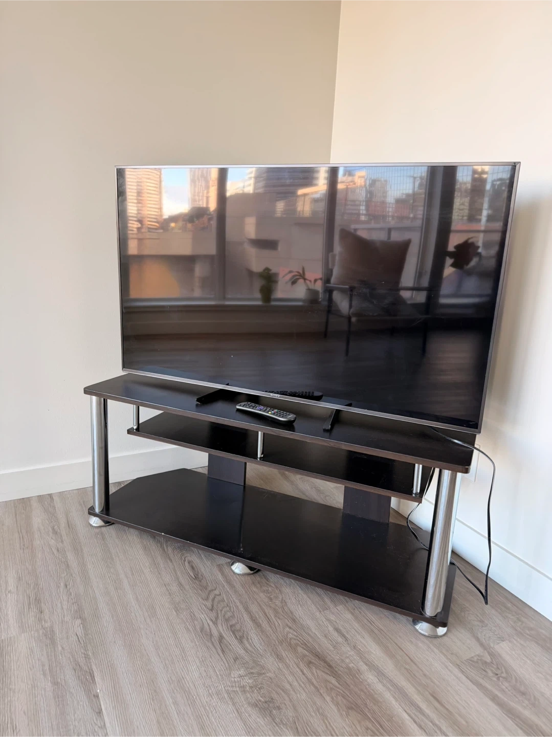 Selling a 50” Sony TV that's in great condition. It comes with a dark brown TV stand that has shelves for your media devices or decorations. Also includes the remote control. It's a great setup for any living room or entertainment area. TV stand is 43”W x 17.5”H x 15.75”D