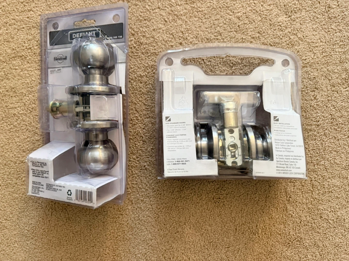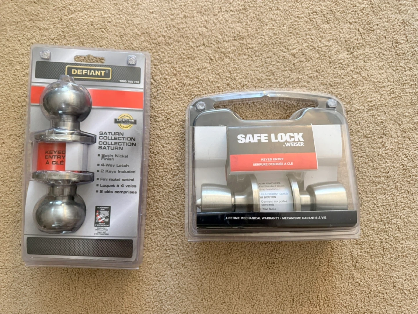 Two brand new door knob sets still in their original packaging! One is a Defiant Saturn Collection in satin nickel finish without keys. The other is a Weiser Safe Lock keyed entry set.