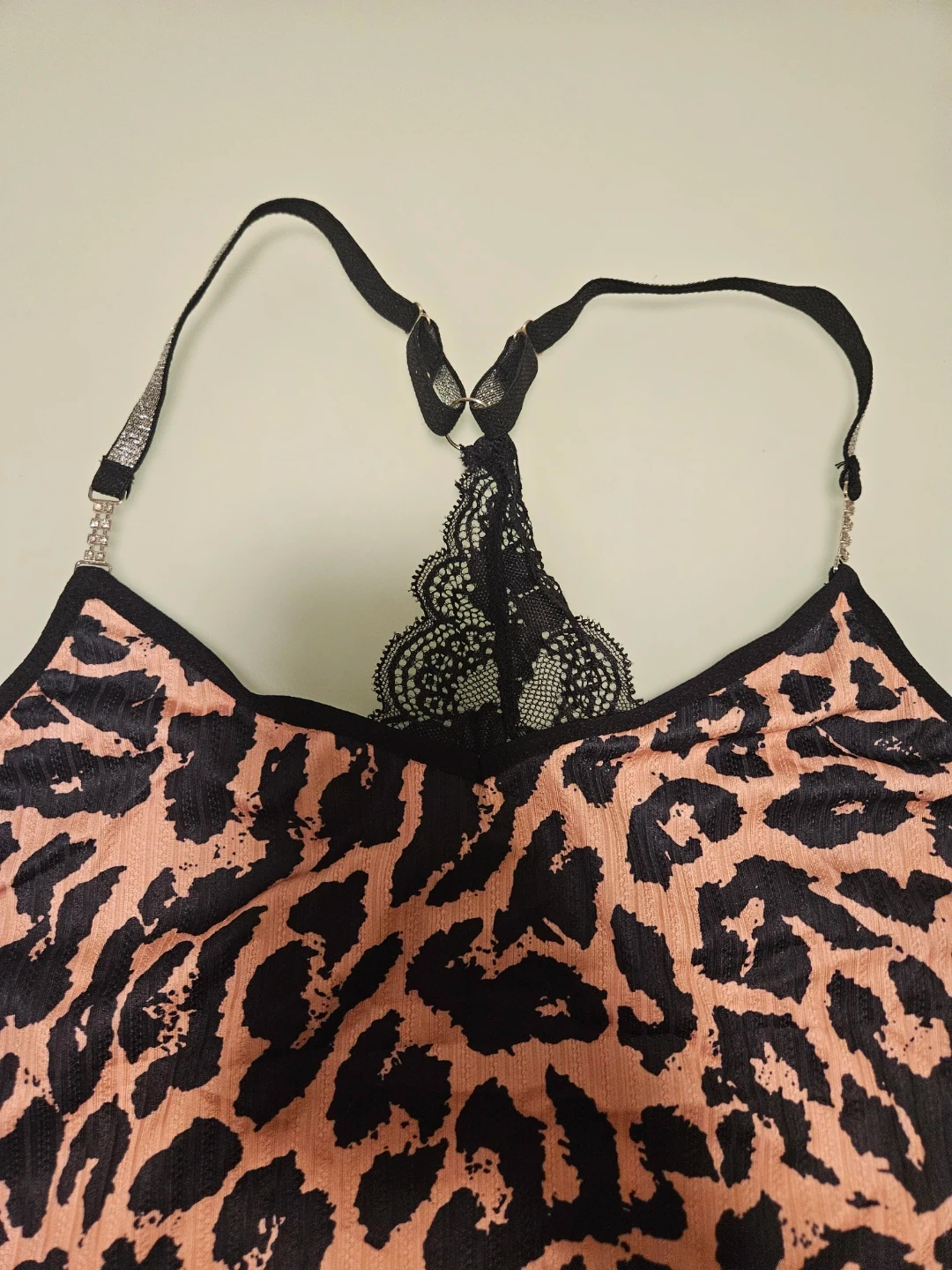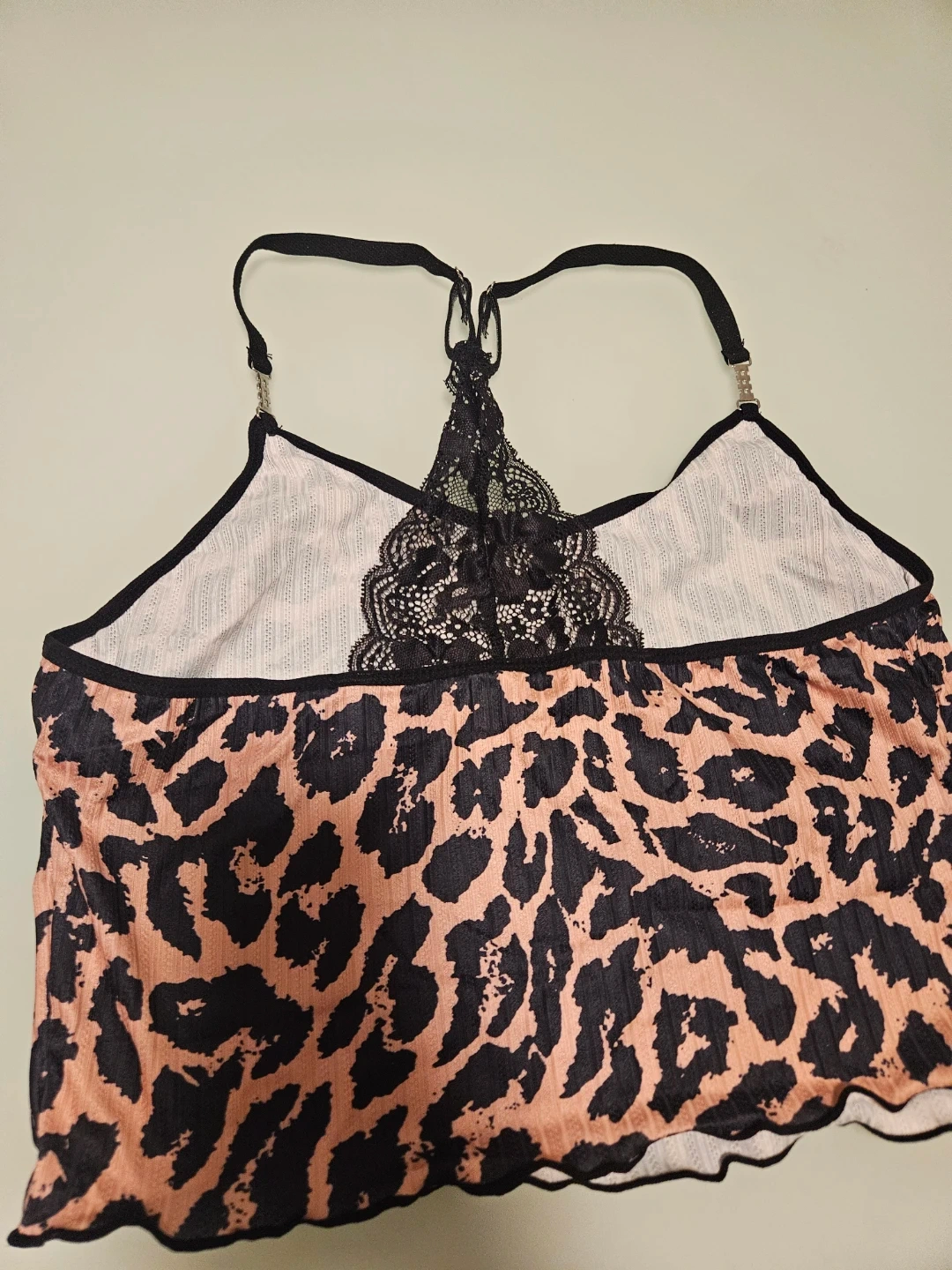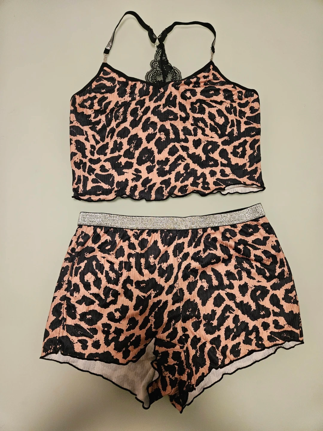 This is a cute leopard print sleepwear/lingerie set! The top features a lace detail on the back and sparkly straps. The shorts have a sparkly waist band as well! Perfect for lounging or a night out. Brand new, never worn. Size large.