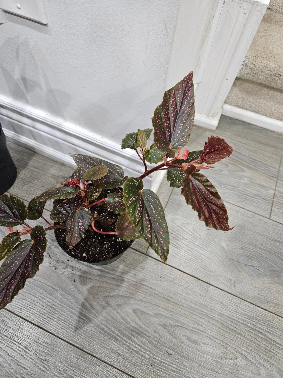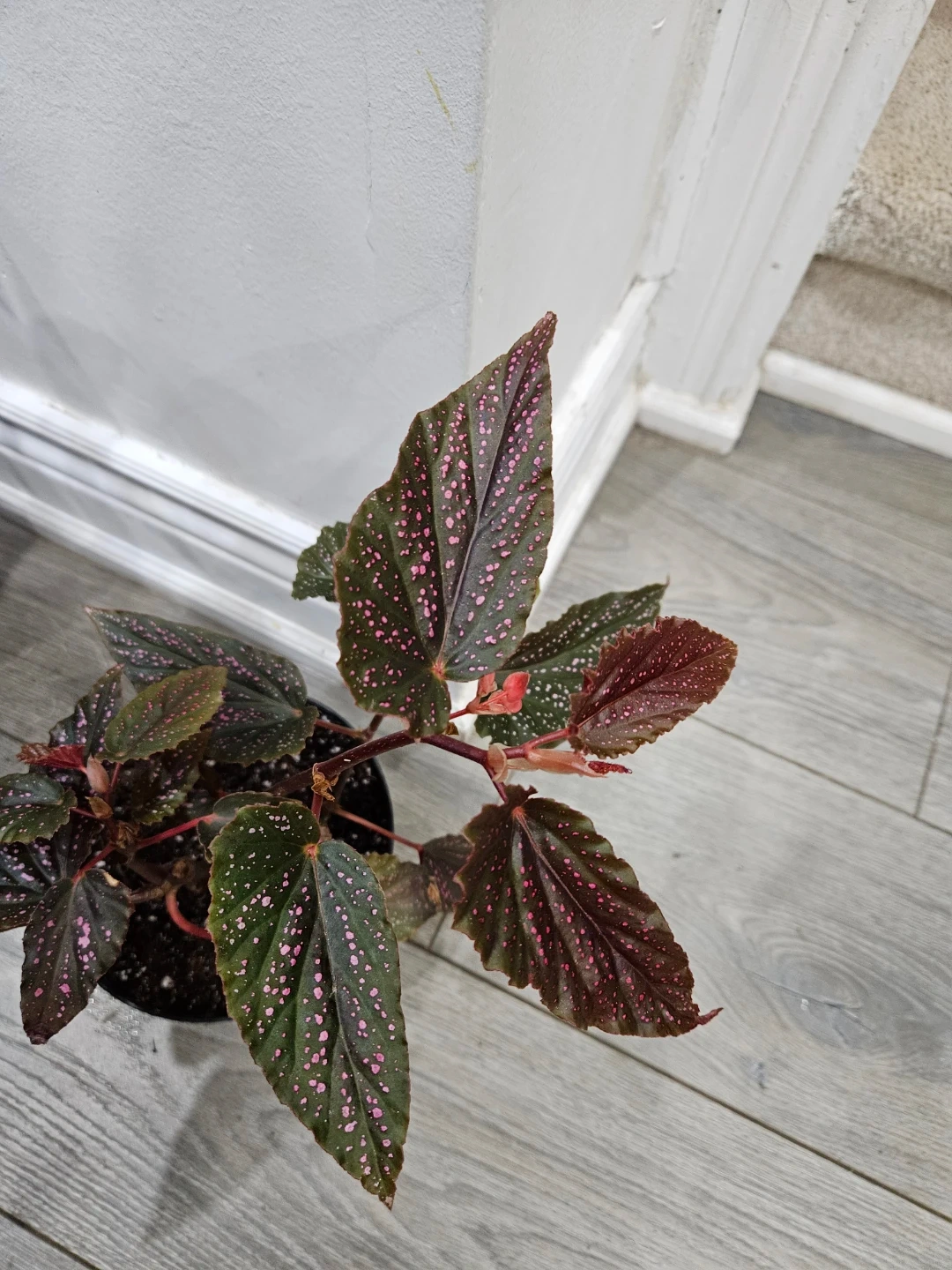 This is a beautiful Maculata pink spot begonia plant! It has lovely green and maroon leaves with pink polka dots. The plant is in a black pot and is ready to brighten up your space
