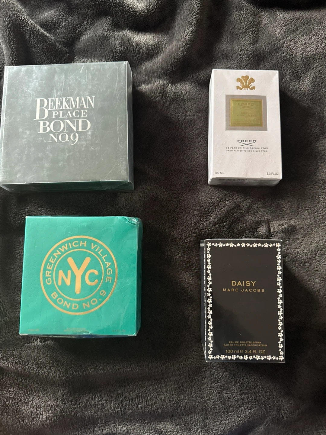 Selling four perfume boxes including Beekman Place Bond No. 9, Greenwich Village Bond No. 9, Creed 100ml, and Daisy Marc Jacobs 100ml