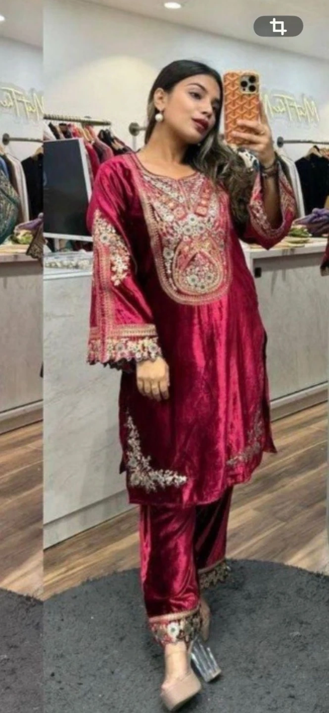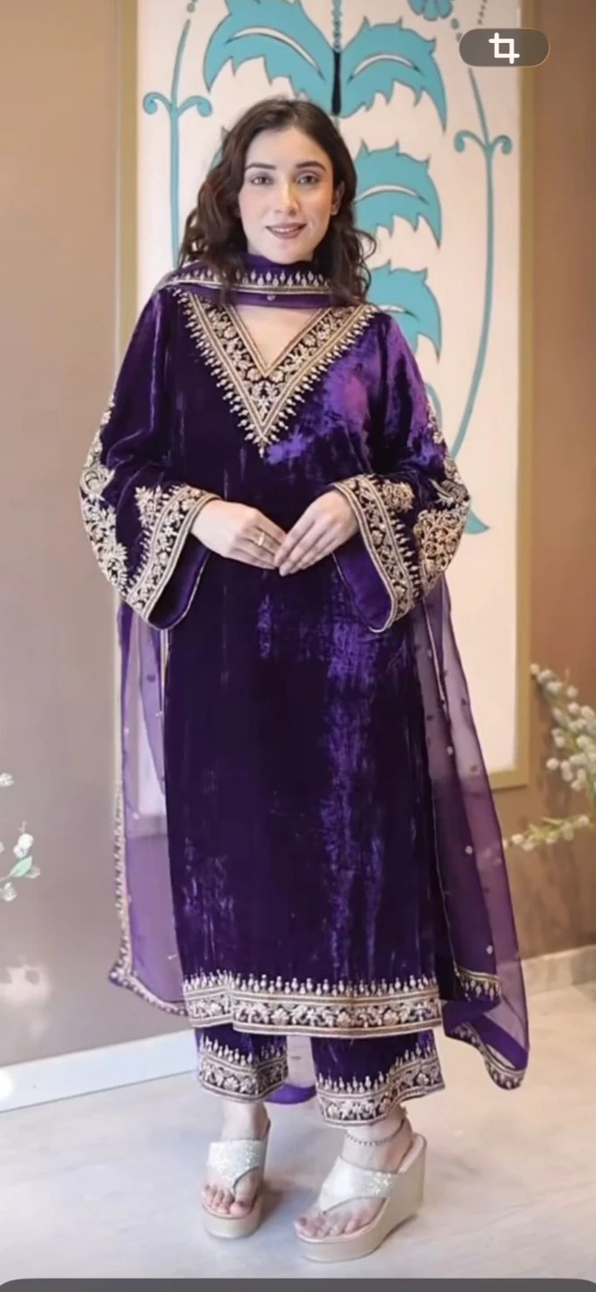 Beautiful velvet salwar kameez suit with intricate embroidery. Perfect for a special occasion or adding a touch of elegance to your wardrobe