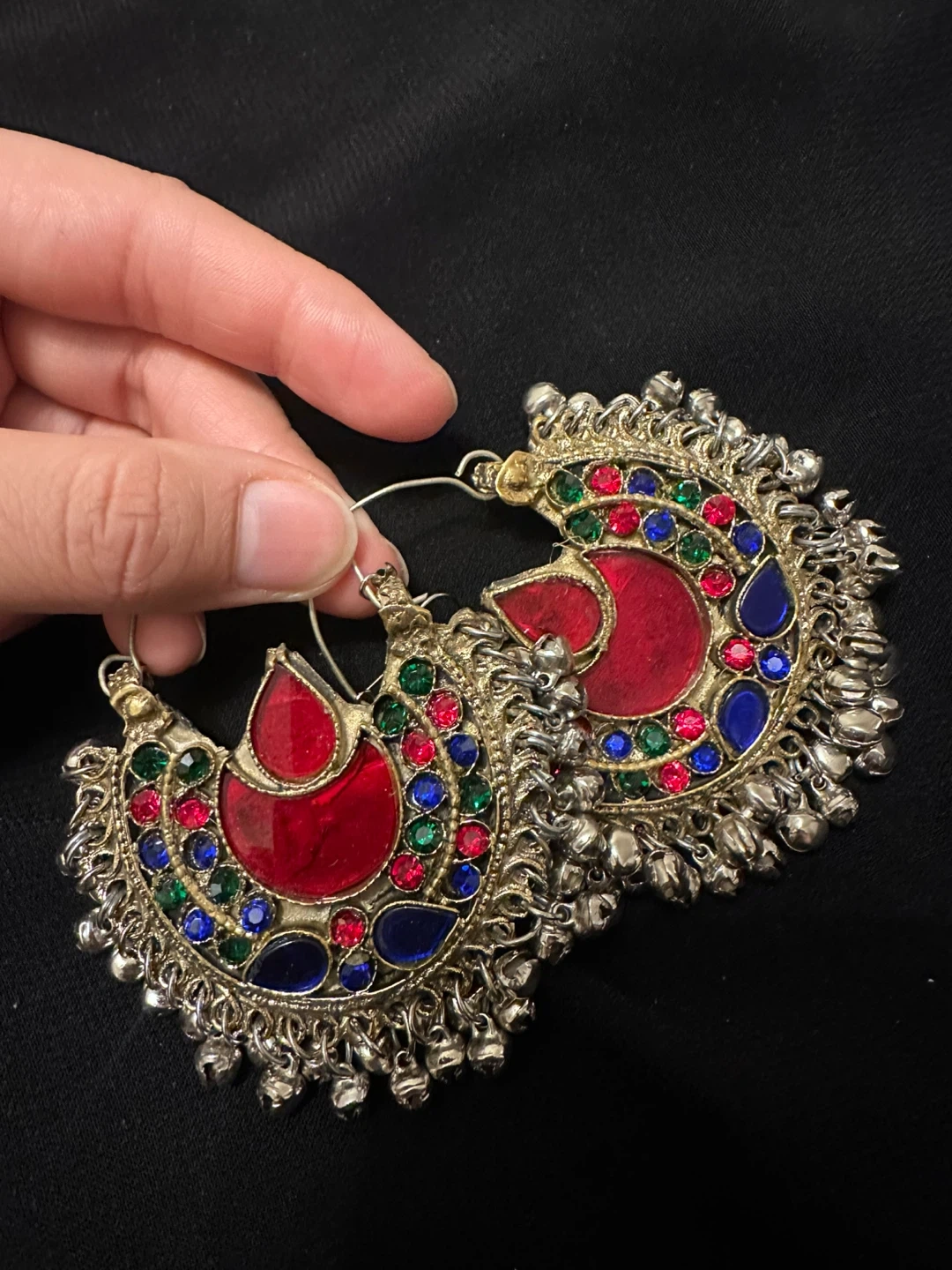 Selling a pair of beautiful Afghan style earrings! They feature colourful stones in red, blue, and green, with silver-tone metal and delicate bell charms. Perfect for adding a unique touch to any outfit!