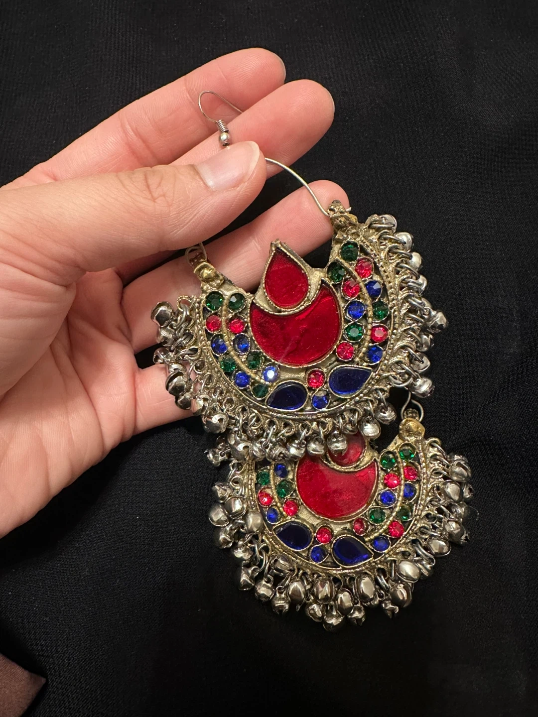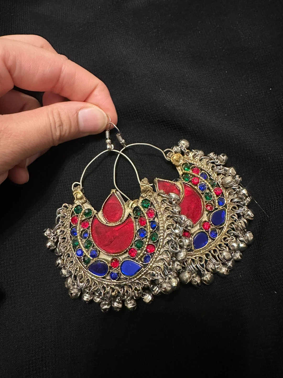 Selling a pair of beautiful Afghan style earrings! They feature colourful stones in red, blue, and green, with silver-tone metal and delicate bell charms. Perfect for adding a unique touch to any outfit!