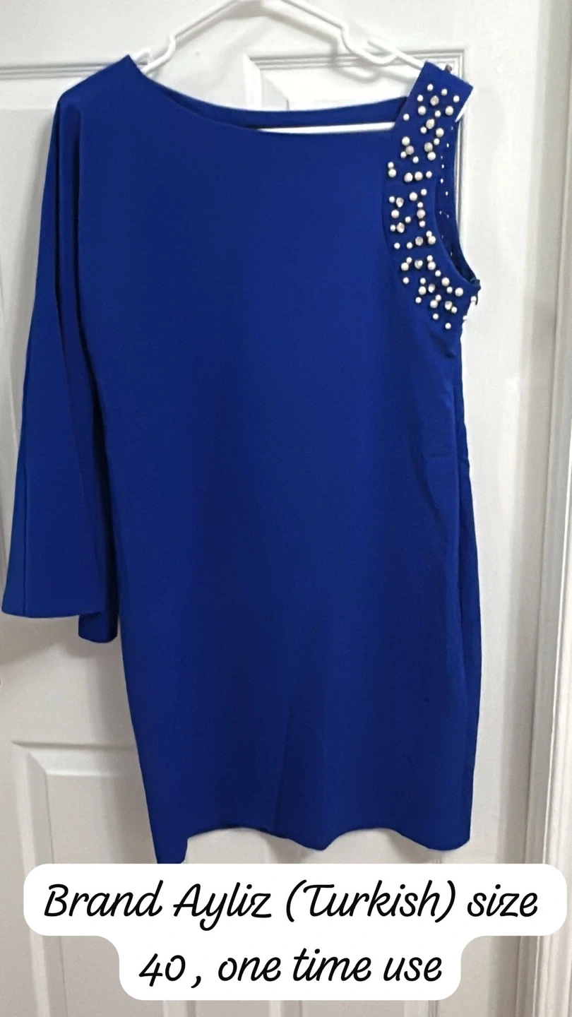 Selling a beautiful blue dress from the brand Ayliz (Turkish). It's a size 40 and has only been worn once! It features a unique design with pearl embellishments on one shoulder. Perfect for a special occasion or a night out