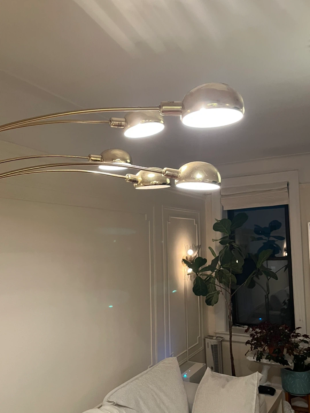 Selling a gold arc floor lamp! It's in great condition and would look great in any living room or bedroom. Has a dimmer. 88” tall. The lights extend out about 4 ft.