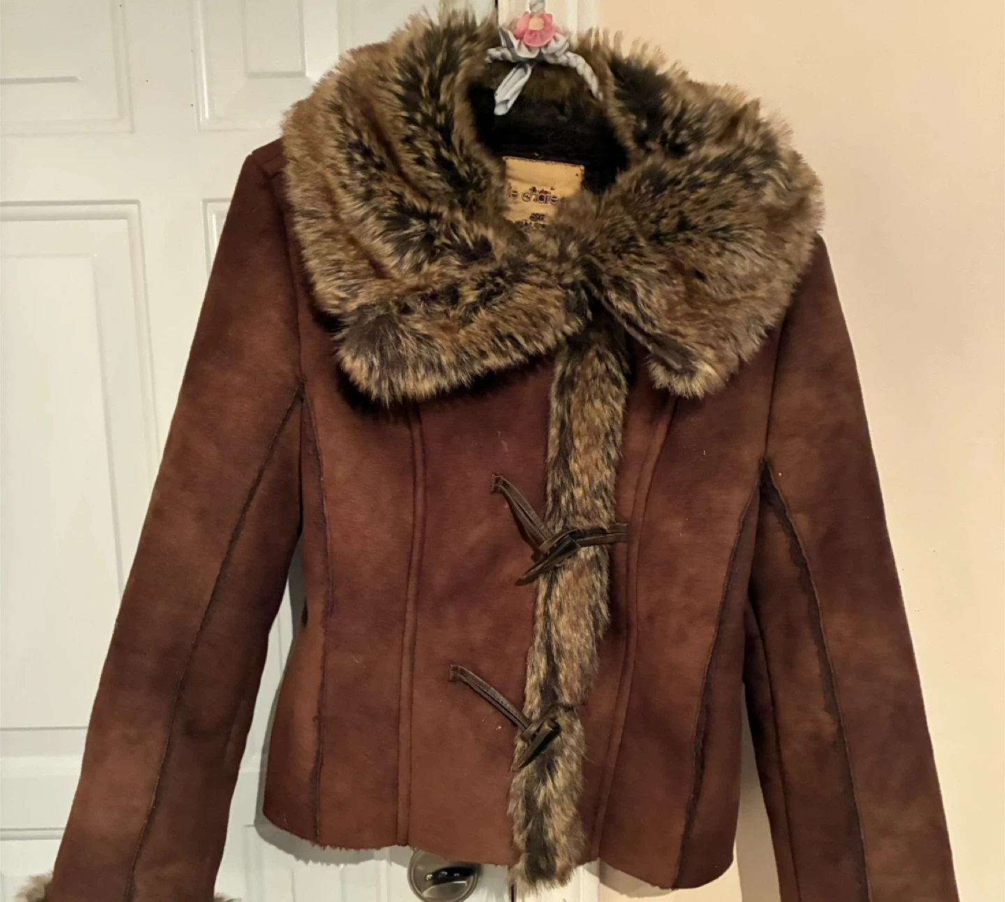 Cozy up in this Le Chateau jacket! It features a faux suede exterior in a rich brown colour, complemented by faux fur trim. Perfect for adding a touch of warmth and style to your outfit. Machine washable. Size small.