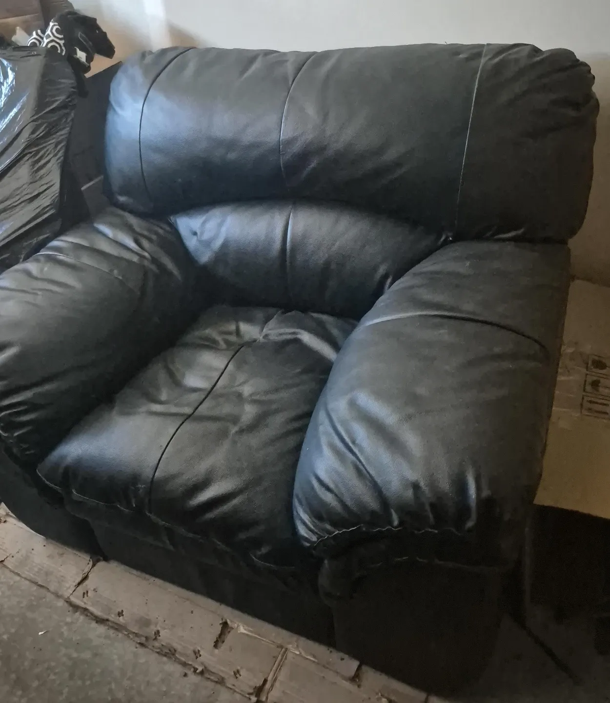 Here's a comfy black leather armchair! It's in good condition and perfect for a reading nook or living room. The leather is soft and the cushions are plush, making it a great spot to relax after a long day